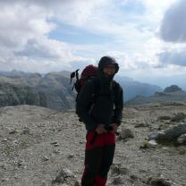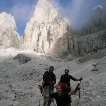 In der Nacht hörten wir es Donnern und Regnen, aber um 7 Uhr als wir aus dem Fenster schauten, sahen wir nur blauen Himmel und Sonne. Nach dem frühstück packten wir unsere Rucksäcke und los ging es in Richtung Sas de Pordoi. Wir mussten zuerst über eine kleine Scharte und dann abwärts zum Rifugio Pordoi auf 2829 m. Die Wanderung führte uns durch eine Mondlandschaft, sehr karg, aber doch atemberaubend.
