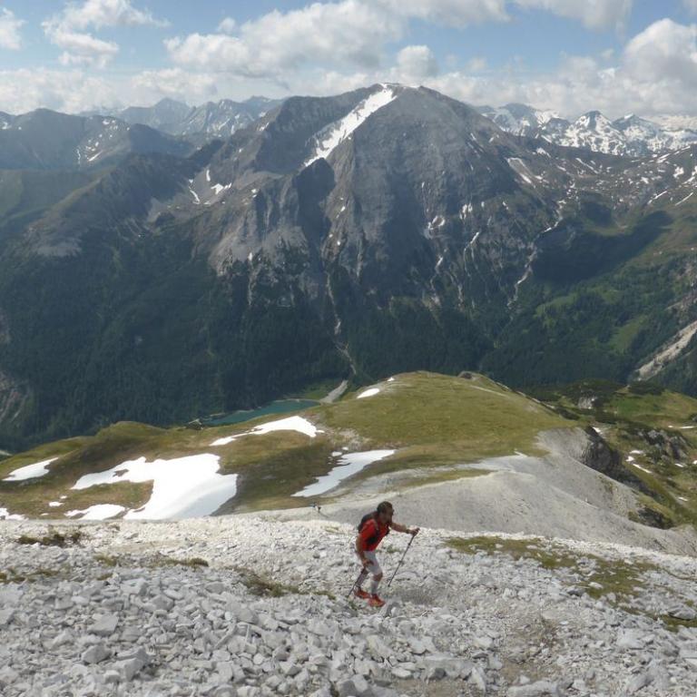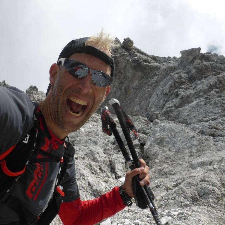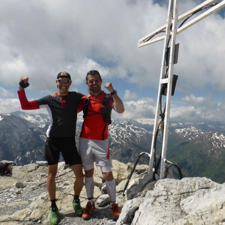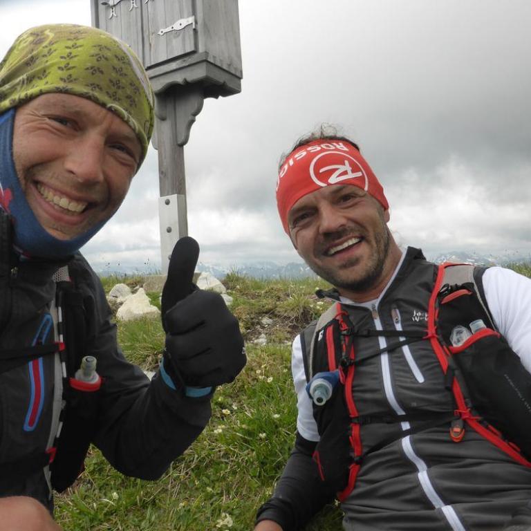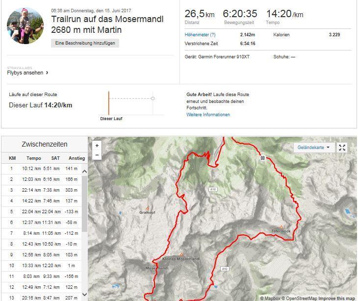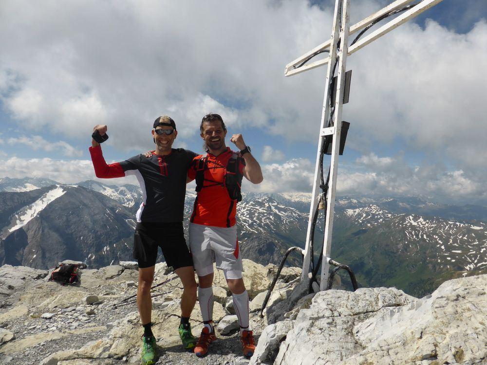 Ballern war am Donnerstag angesagt. Und dafür war Martin genau der Richtige. Um halb 7 standen wir beide im vollen Traillaufoutfit vor der Türe, während die Anderen noch tief und fest schliefen. Wir liefen zuerst eine Forststraße nach oben, die dann in einen steilen Trail mündete. Nach 800 Hm erreichten wir dann die Taferlscharte auf 2236 m. Das Wetter war super, Sonne aber nicht zu warm. Weiter ging es dann bergab auf den schönsten Singletrails. Immer wieder gab es einen knackigen Gegenanstieg. Rock `n Roll hieß es für uns bis wir die gemütliche Jakoberalm auf 1800 m erreichten. Hier genehmigten wir uns eine kühle Cola. Ab hier ging es nur noch bergauf. Zuerst auf Almwegen, aber je höher wir in Richtung Mosermandl kamen, desto steiler wurde es. Endlich erreichten wir eine Scharte, von der uns ein Geröllfeld in Richtung Gipfel führte. Die Markierungen waren spärlich, was aber die Spannung erhöhte. Nach dem Geröllfeld wurde es felsiger und wir mussten teilweise 2 er Kletterstellen überwinden. Das machte Spaß, nur vorsichtig musste man sein, da der Felsen extrem scharfkantig war. Nach mittlerweile 4 Stunden standen wir auf dem Gipfel des Mosermandls 2680 m. Martin und ich sind schon ein super Team, wo das Ballern einfach Spaß macht :-) Wir genossen die herrliche Aussicht auf die umliegenden Bergen, wie das gigantische Dachsteinmasiv. Mit 3 Wanderern mussten wir uns den Gipfel teilen.