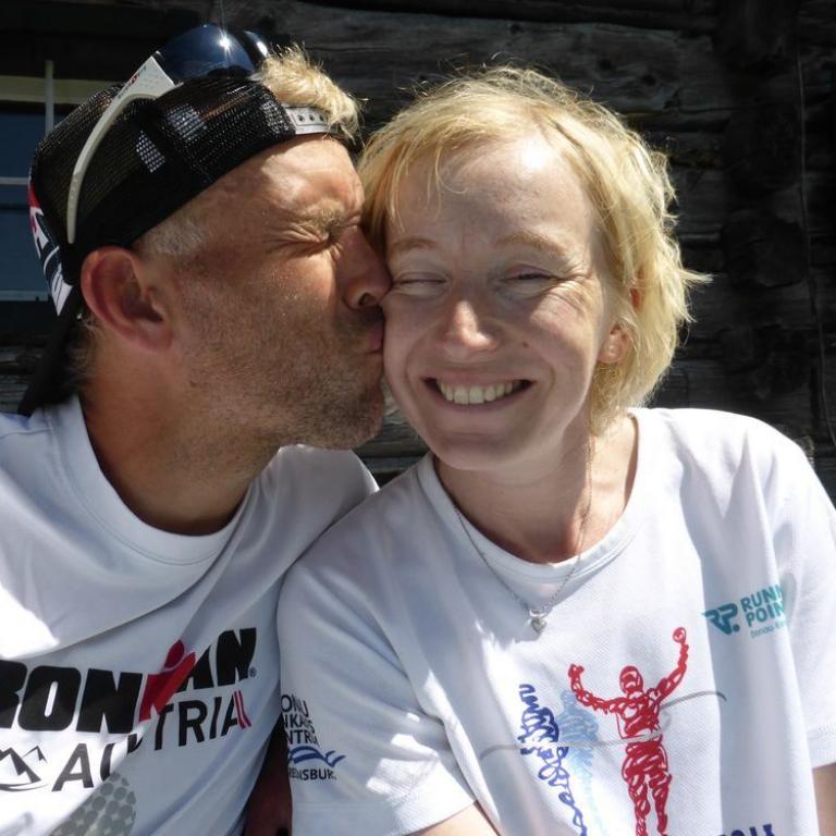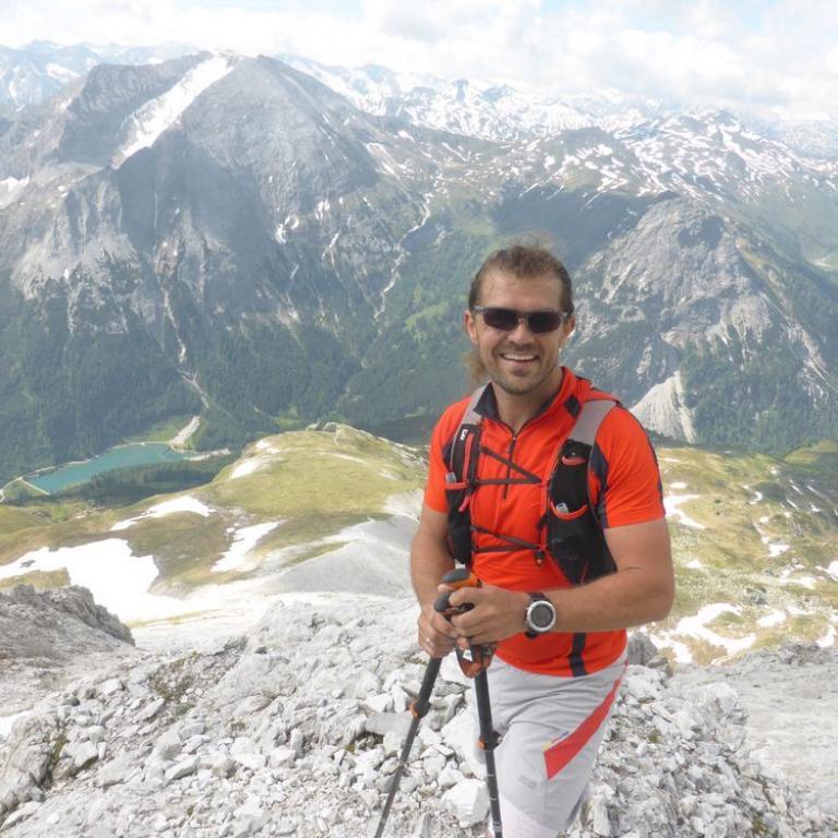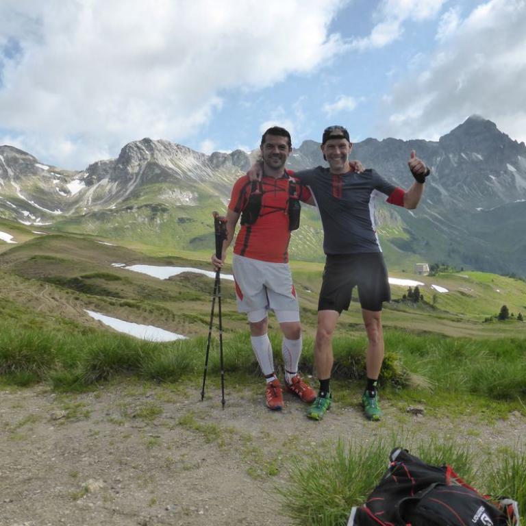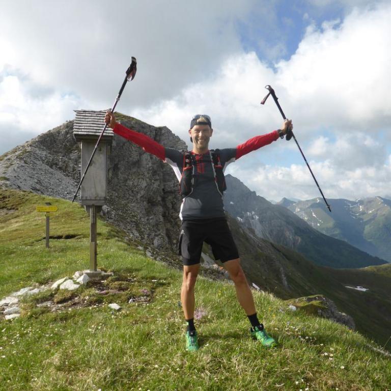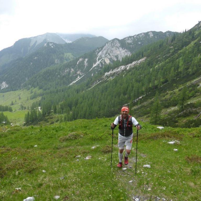 Ballern war am Donnerstag angesagt. Und dafür war Martin genau der Richtige. Um halb 7 standen wir beide im vollen Traillaufoutfit vor der Türe, während die Anderen noch tief und fest schliefen. Wir liefen zuerst eine Forststraße nach oben, die dann in einen steilen Trail mündete. Nach 800 Hm erreichten wir dann die Taferlscharte auf 2236 m. Das Wetter war super, Sonne aber nicht zu warm. Weiter ging es dann bergab auf den schönsten Singletrails. Immer wieder gab es einen knackigen Gegenanstieg. Rock `n Roll hieß es für uns bis wir die gemütliche Jakoberalm auf 1800 m erreichten. Hier genehmigten wir uns eine kühle Cola. Ab hier ging es nur noch bergauf. Zuerst auf Almwegen, aber je höher wir in Richtung Mosermandl kamen, desto steiler wurde es. Endlich erreichten wir eine Scharte, von der uns ein Geröllfeld in Richtung Gipfel führte. Die Markierungen waren spärlich, was aber die Spannung erhöhte. Nach dem Geröllfeld wurde es felsiger und wir mussten teilweise 2 er Kletterstellen überwinden. Das machte Spaß, nur vorsichtig musste man sein, da der Felsen extrem scharfkantig war. Nach mittlerweile 4 Stunden standen wir auf dem Gipfel des Mosermandls 2680 m. Martin und ich sind schon ein super Team, wo das Ballern einfach Spaß macht :-) Wir genossen die herrliche Aussicht auf die umliegenden Bergen, wie das gigantische Dachsteinmasiv. Mit 3 Wanderern mussten wir uns den Gipfel teilen.