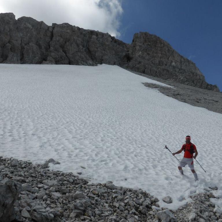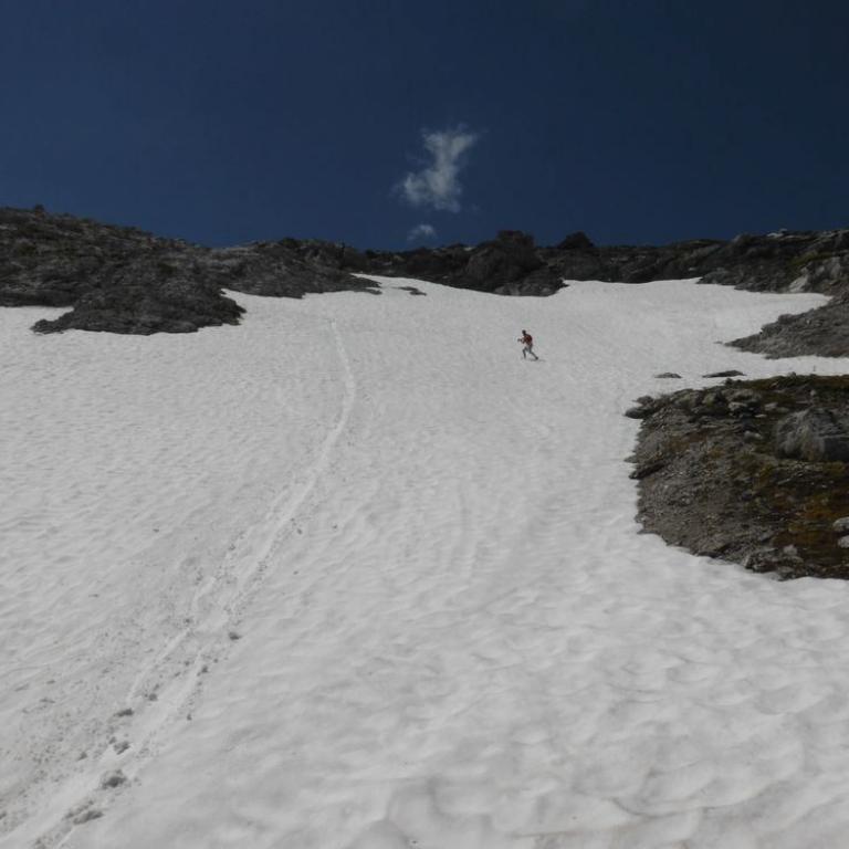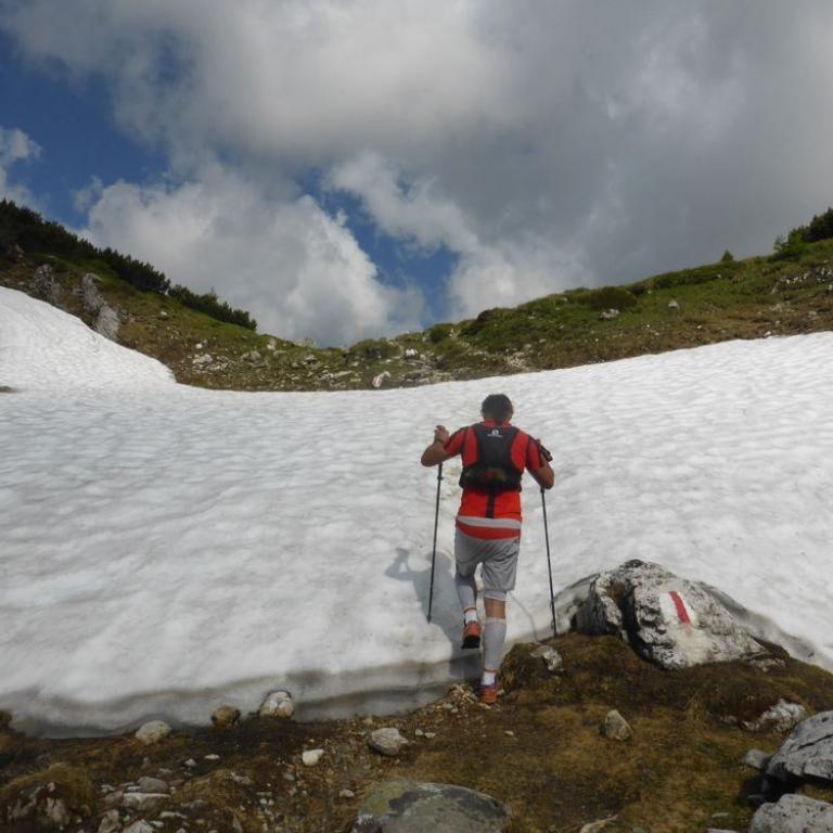 Nordseitig wollten wir wieder über einen einfachen Klettersteig (Schwierigkeit: B) absteigen. Vom Gipfel sahen wir die vielen Schneefelder, die wir überqueren mussten. Mal schauen ob wir da den Weg finden. Der Klettersteig war dann doch ganz pfiffig, da wir ja ohne Sicherung runter mussten. Aber no risk no fun :-) Nach dem Klettersteig liefen wir auf dem 731 Weg über ein weiteres Geröllfeld bis wir dann die ersten Schneefelder erreichten. Diese waren nicht vereist, so dass wir ohne Probleme rüber laufen konnten. Bei einem steilen Schneefeld machten wir uns den Spaß auf dem Hintern runter zu rutschen. Sau cool, nur patsch nass wurden wir bis auf die Unterhose. Das war es aber wert. Leider verloren wir dadurch auch etwas die Orientierung. Erst nach einiger Zeit und ein paar Bonusmetern fanden wir wieder den richtigen Weg, der uns in ein steiles Waldstück führte. Das ging beim Laufen auf die Oberschenkel. Endlich erreichten wir die Tauernautobahn unter der wir durch liefen. Jetzt hatten wir noch 300 Hm Aufstieg bis zur Hütte. Wir quälten uns noch nach oben, bis wir unsere Hütte erreichten. Das kühle Radler schmeckte besonders gut nach 27 km 2100 Höhenmetern und über 6 Stunden Trailrun. Danke an Martin für die mega coole Tour. Das war Trailrun in vollster Vollendung :-)