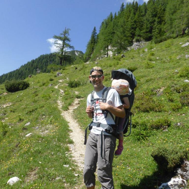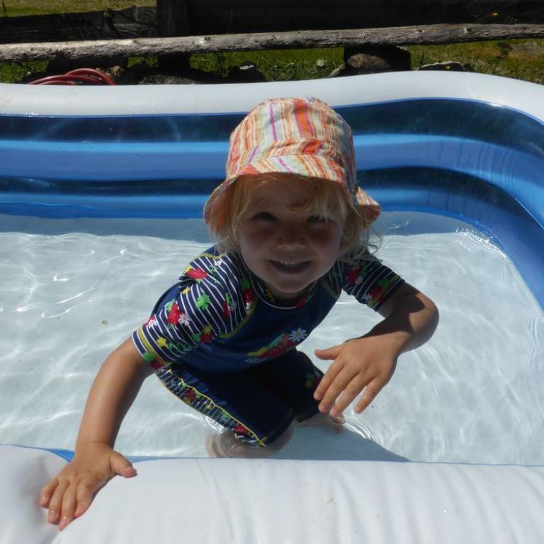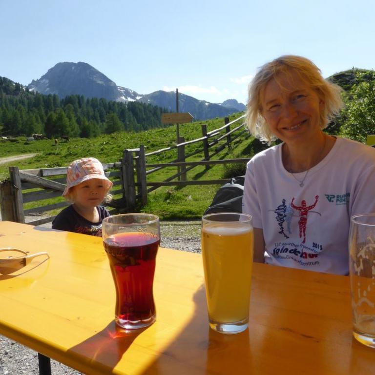Die Kinder waren begeistert vor der Hütte im Planschbecken zu baden und zu spielen. Damit mir nach der Hammertour nicht langweilig wurde, wanderte ich mit Emma in der Kraxn und Brigitte und extrem schweren Füßen 400 Höhenmeter auf einem steilen Trail bis zur Südwienerhütte auf 1801 m. Hier genossen wir die Aussicht, Radler und Kuchen. Schön war es mit meinen Mädels. Am Abend grillte Lobbe für uns leckere Würstl und Fleisch.