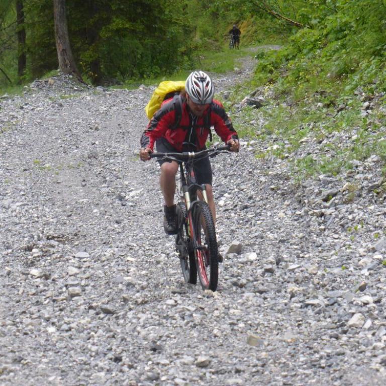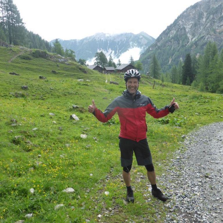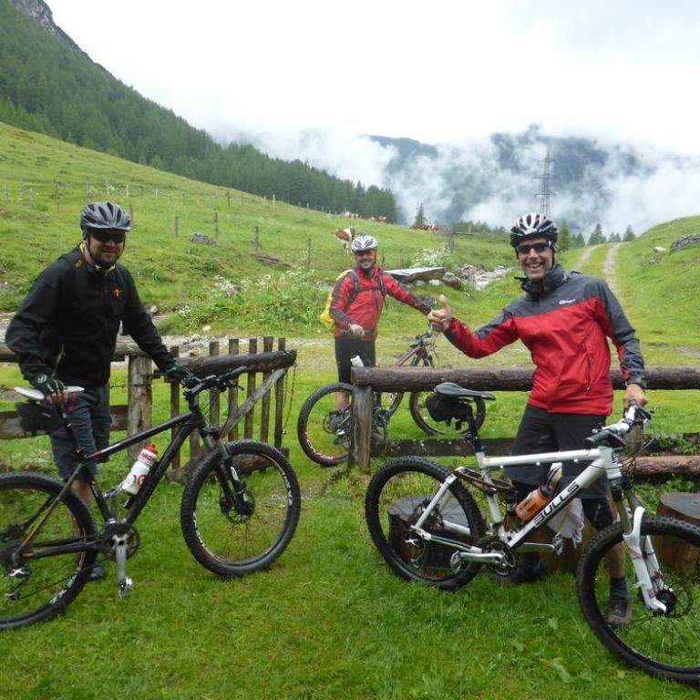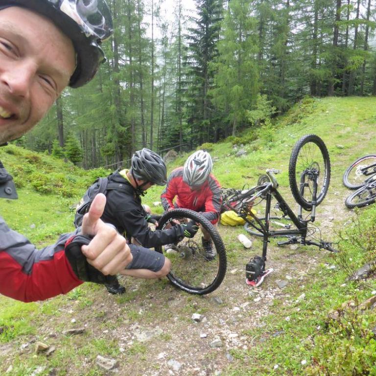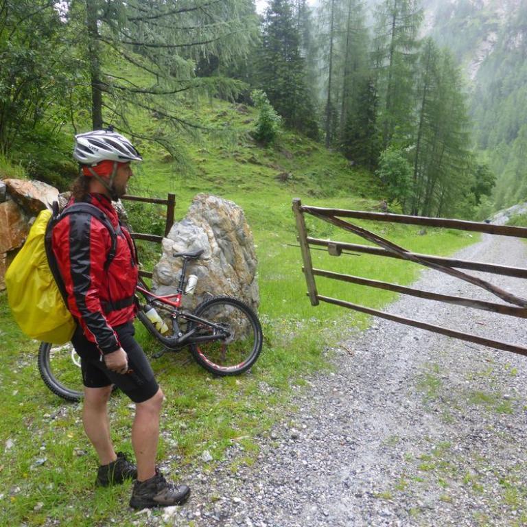 Leider schlug das Wetter in der Nacht um und am Freitagmorgen regnete es in Strömen. So ein Sauwetter. Aber das hielt Lobbe, Martin und mich nicht ab mit dem MTB auszurücken. Nach 800 m hatte Lobbe gleich den ersten Platten. Aber schnell war der gewechselt und weiter konnte es nach unten gehen, bis wir den Abzweig zur Ursprungalm (1531 m) fanden. Hier mussten wir teilweise einen extrem steilen Forstweg nach oben drücken. Das machte den Oberschenkeln Spaß 12 Immer wieder regnete es. Lobbe fuhr dann den direkt Weg zurück zur Hütte und Martin und ich quälten uns noch auf der anderen Seite der Tauernautobahn bis zur Südwiener Hütte auf 1801 m hoch. Auch hier regnete es wieder leicht und der Wind pfiff uns um die Ohren. Einen steilen Singletrail fuhren wir nach unten, wobei ich die meiste Zeit schieben musste. Martin ist da technisch viel besser drauf als ich. Aber auch ich erreichte wieder unsere Almhütte.