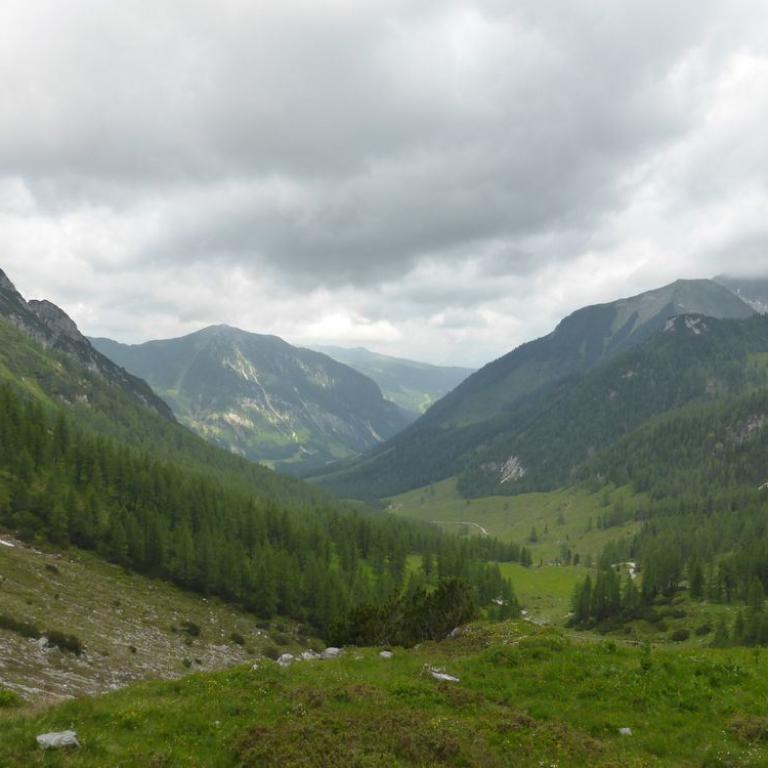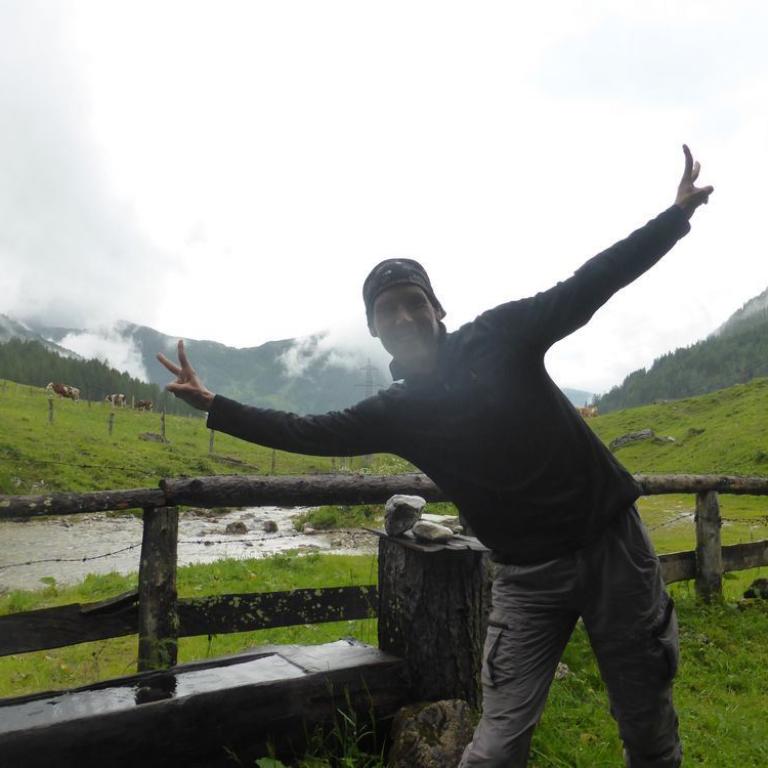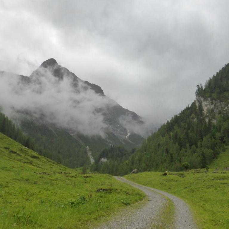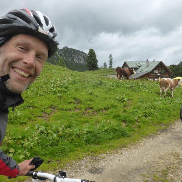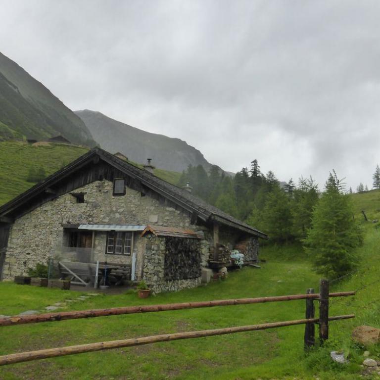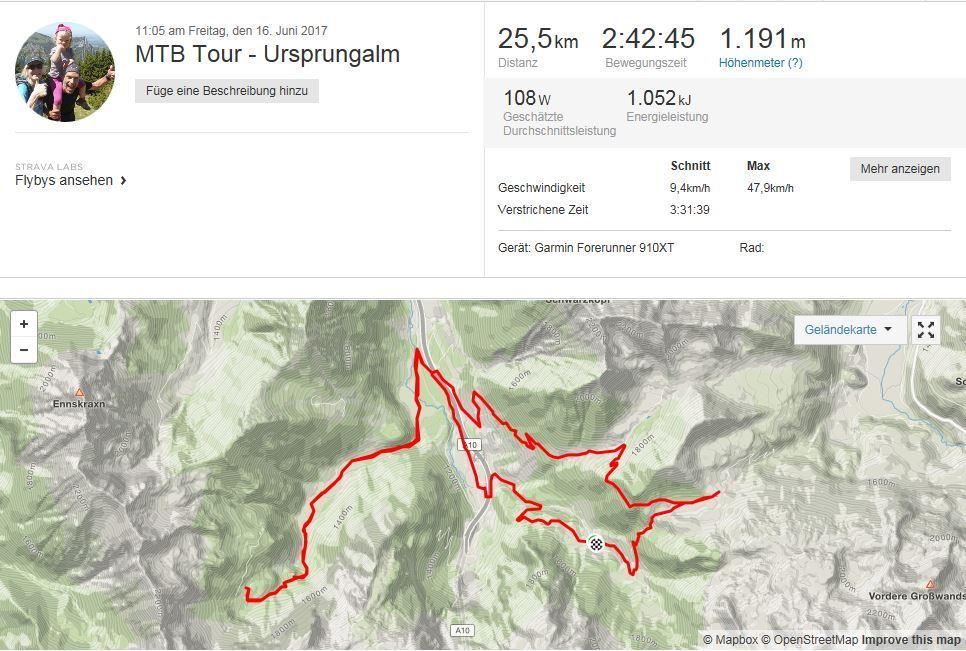 Leider schlug das Wetter in der Nacht um und am Freitagmorgen regnete es in Strömen. So ein Sauwetter. Aber das hielt Lobbe, Martin und mich nicht ab mit dem MTB auszurücken. Nach 800 m hatte Lobbe gleich den ersten Platten. Aber schnell war der gewechselt und weiter konnte es nach unten gehen, bis wir den Abzweig zur Ursprungalm (1531 m) fanden. Hier mussten wir teilweise einen extrem steilen Forstweg nach oben drücken. Das machte den Oberschenkeln Spaß 12 Immer wieder regnete es. Lobbe fuhr dann den direkt Weg zurück zur Hütte und Martin und ich quälten uns noch auf der anderen Seite der Tauernautobahn bis zur Südwiener Hütte auf 1801 m hoch. Auch hier regnete es wieder leicht und der Wind pfiff uns um die Ohren. Einen steilen Singletrail fuhren wir nach unten, wobei ich die meiste Zeit schieben musste. Martin ist da technisch viel besser drauf als ich. Aber auch ich erreichte wieder unsere Almhütte.