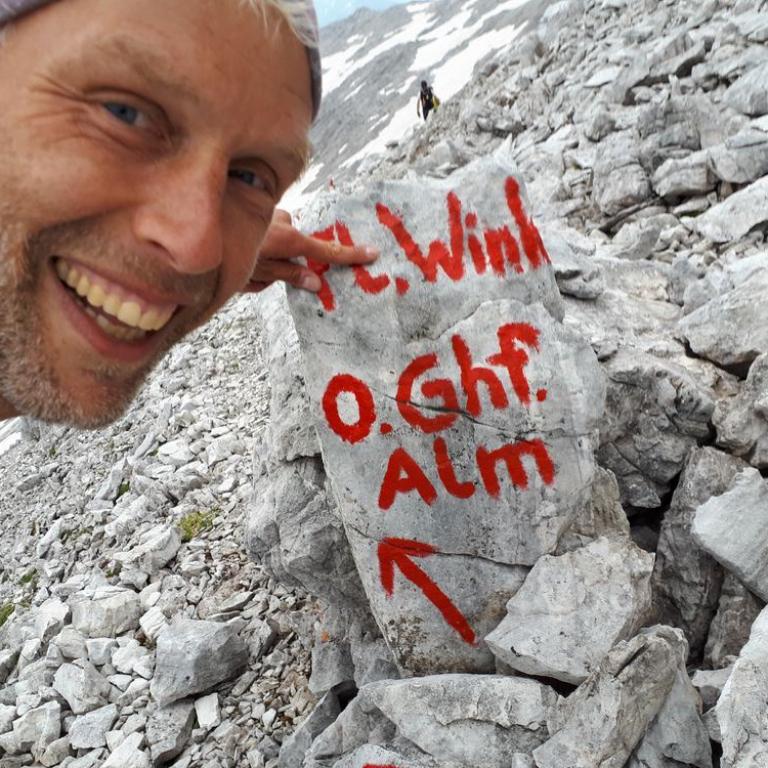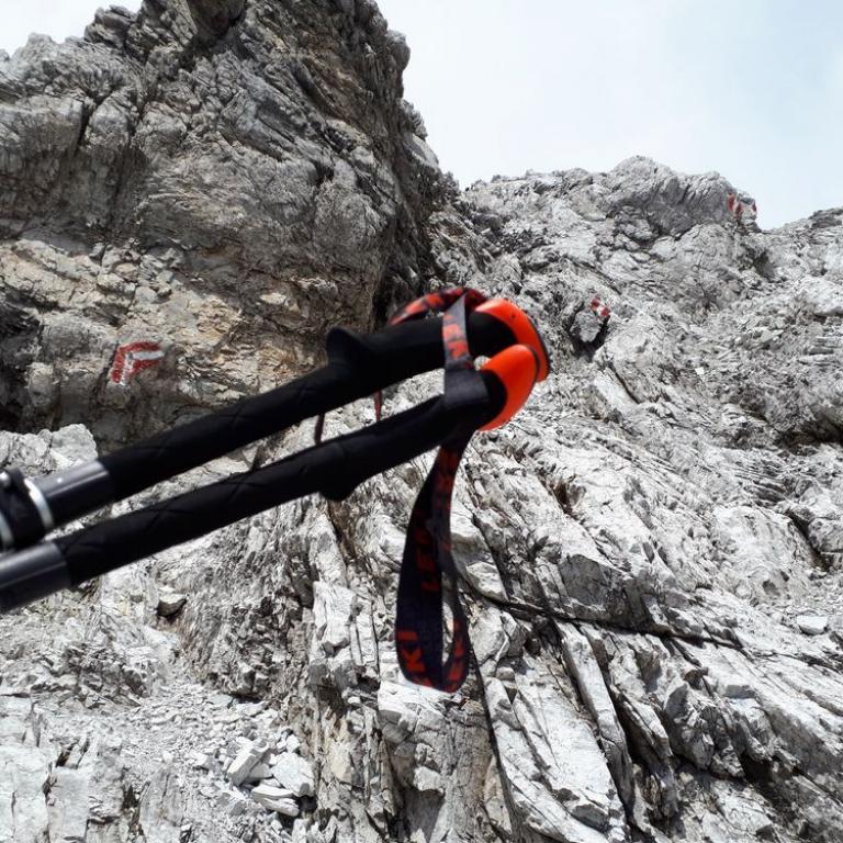 So richtig fit war ich am nächsten Morgen nicht. Die lange Fahrt, dass ein oder andere Bier und der wenige Schlaf taten sein Übriges. Aber um kurz nach 9 Uhr starteten Tobi, Martin und ich in Richtung Mosermandl. Da für Nachmittag Gewitter angesagt wurde, mussten wir uns sputen. Nach 1 Stunde standen die drei Trailläufer an der Tafelscharte. Die ersten 800 Höhenmeter hatten wir schon in der Tasche. Auf pfiffigen Singletrails erreichten wir die Jakoberalm auf 1800 m. Leider hatte diese geschlossen. Von hier führte uns ein steiler Anstieg zum Mosermandl. An der Südseite stiegen wir zuerst ein Geröllfeld nach oben. Leider donnerte es immer wieder und die Gewitter kamen näher. Trotzdem entschieden wir uns den Gipfelansturm zu wagen, was uns fast zum Verhängnis werden sollte. Zum Schluss durften wir noch eine ausgesetzte Kletterei bis zum Gipfel genießen. Am Gipfel hielten wir uns nicht lange auf, da die Wolken immer dunkler wurden. Zuerst auf einer ausgesetzten Passage und dann Stahlseilversicherten Rinne, die teilweise vereist war, kämpften wir uns an der Nordseite nach unten, bis wir wieder Geröllfelder erreichten. Seitwärts über Schneefelder, wo wegrutschen verboten war, ging es weiter bergab. Zefix ich stellte fest das ich meine nicht gerade billigen Leki Stöcke auf dem Gipfel vergessen hatte. Ich sah die dunklen Wolken und stellte fest, dass Umkehren keine Option war.