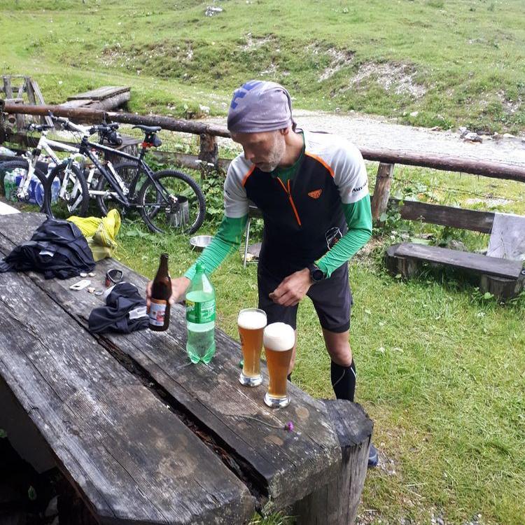 Irgendwie konnten wir den Verlust unserer Stöcke nicht auf uns sitzen lassen, deshalb schmiedeten Martin und ich den Plan ein weiteres Mal den Gipfel zu erklimmen. Das Wetter war für Freitag vielversprechend: Regen, kalt und vor allem keine, überhaupt keine Sonne :-) Als alle noch schliefen fuhren wir bei strömendem Regen mit den Mountainbikes in Richtung Flachauwinkl und von dort bis kurz vor der Ursprungalm. Unsere Bikes versteckten wir in den Bäumen und liefen zu Fuß weiter. Zuerst auf Forstwegen und dann auf kleinen Singletrails immer weiter nach oben. Unser erstes Ziel sollte die Windischscharte auf 2298 m sein. Teilweise war der Trail ausgesetzt und mit einem Stahlseil gesichert. Immer wieder räkelten sich Bergsalamander auf der Strecke. Wir musste schon aufpassen keinen der kleinen Kerle zu zertreten. Wir mussten beim Neukarsee einen Bach überqueren, der dank des vielen Regens doch ziemlich breit war. Hier holten wir uns schon mal nasse Füße. Langsam kamen auch die Schneefelder. Die geringe Sicht durch den dichten Nebel erschwerte die Suche nach dem richtigen Weg. Immer wieder mussten wir umkehren und es auf der anderen Seite des Schneefeldes erneut versuchen. Endlich erreichten wir die Windischscharte. Vor uns konnte man im Nebel die schneebedeckten Steilhänge des Mosermandls erahnen. Wir liefen, bzw. suchten weiter den Weg, der unter den vielen Schneefeldern verborgen war. Nach vielen Umkehr, Kletter - und Suchaktionen kamen wir endlich zur Weggabelung, wo es östlich nach unten ging und nach oben in den Klettersteig zum Mosermandl führte. Mittlerweile war es ziemlich eisig geworden und ich spürte meine Finger in den nassen Handschuhen kaum mehr. Trotzdem kletterten wir die seilversicherte, aber vereiste Rinne bis zum Gipfel nach oben. Yheeaaa, meine Stöcke standen noch am Gipfelkreuz, so wie ich sie vor 2 Tagen vergessen hatte. Ich stopfte sie in den Laufrucksack und wir machten uns auch wegen dem ungemütlichen Wetter schnell wieder auf den Weg nach unten. Und noch einmal kletterten wir durch die Rinne, bis zur Abzweigung. Bergab passierten wir Schneefelder, bis wir im dichten Nebel direkt vor der Höhle standen, in der wir vorgestern Schutz vor dem Gewitter suchten. Und auch hier waren wir erfolgreich. Auch Martins Stöcke lagen noch unberührt in der Höhle. Glücklich über unsere erfolgreiche Mission liefen wir zurück ins Tal und von dort bis zur Ursprungalm hinauf, wo unsere Mountainbikes standen. Durchnässt fuhren wir mit den Bikes ins Tal, um auf der anderen Seite bis zu unserer Hütte hochzudrücken. Hier ging mir nach fast 7 Stunden Ballern der Saft aus und ich kam gerade noch so nach 1 1/2 Stunden MTB mit 600 Höhenmetern und 17 Km und 5 Stunden Trails mit 22 km 1700 Höhenmetern ins Ziel :-) Unsere Kinder empfingen uns freudestrahlend, die Mamas eher nicht, weil wir länger als geplant unterwegs waren :-) Klar freuten wir uns auf den warmen Whirlpool zum Entspannen, bevor es ein leckeres Abendessen gab Mission Stöcke completed :-)