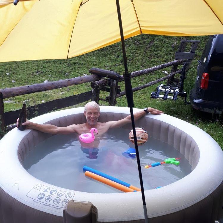 Auf dem 731 er Weg liefen wir über weitere Schneefelder bis wir alle drei gleichzeitig zusammenzuckten. Ein Blitz schoss nicht weit von uns zu Boden. Es fing zu hageln an und wir befanden uns auf einer freien Fläche. Ideale Voraussetzung in den Bergen :-( Weit und breit war kein Unterschlupf zu finden. Doch, direkt vor uns lag eine kleine Höhle. Wir krochen hinein. So richtig gemütlich war es zwar nicht, aber sicherer als draußen. Die Hagelkörner fanden den Weg durch die Ritzen und es wurde ganz schön eisig. Nach einigen Minuten war das Gewitter einige hundert Meter von uns weg. Wir wagten es weiterzulaufen, obwohl es von allen Seiten her schepperte. Nach einigen Minuten stellte Martin fest, dass es Unentschieden stand. Er hatte seine Lekis in der Höhle vergessen Auch dieses Mal war Umkehren keine Option. Dumm und Dümmer war der beste Ausdruck :-) Wir liefen immer weiter nach unten und die Gewitter verzogen sich ebenfalls immer mehr. Langsam wurde uns wieder wohler. Wir liefen unter der Tauernautobahn hindurch bis zur Gasthofalm und von dort unseren Forstweg bis zur Hütte nach oben. Hier wurden wir von unseren Kindern im warmen Whirlpool mit Wasserpistolen empfangen. Wir hatten uns nach 6 Stunden 26 Kilometern und 2200 Höhenmetern ein leckeres Weißbier verdient. Natürlich sprangen wir auch zu den Zwergen in den Whirlpool