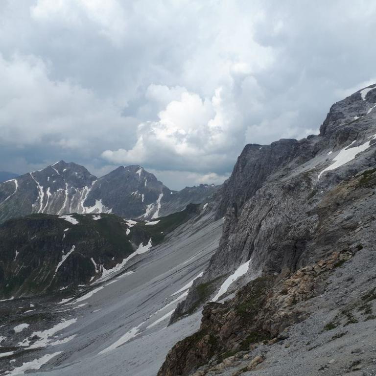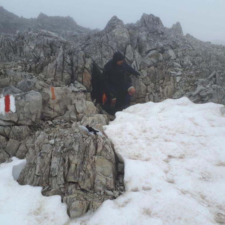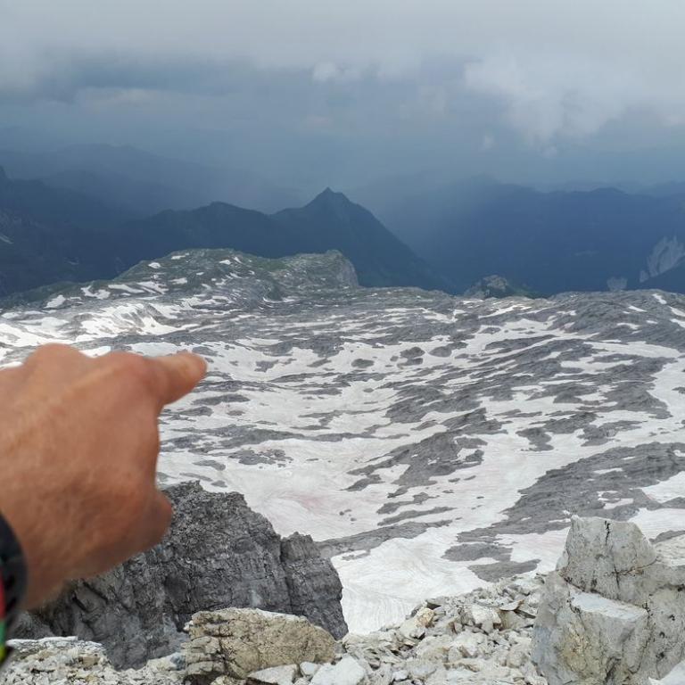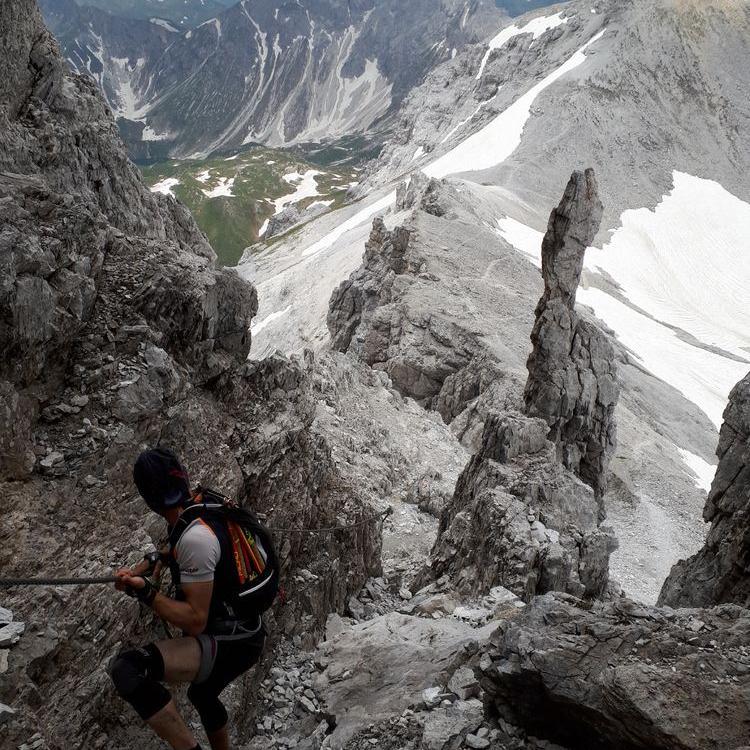 So richtig fit war ich am nächsten Morgen nicht. Die lange Fahrt, dass ein oder andere Bier und der wenige Schlaf taten sein Übriges. Aber um kurz nach 9 Uhr starteten Tobi, Martin und ich in Richtung Mosermandl. Da für Nachmittag Gewitter angesagt wurde, mussten wir uns sputen. Nach 1 Stunde standen die drei Trailläufer an der Tafelscharte. Die ersten 800 Höhenmeter hatten wir schon in der Tasche. Auf pfiffigen Singletrails erreichten wir die Jakoberalm auf 1800 m. Leider hatte diese geschlossen. Von hier führte uns ein steiler Anstieg zum Mosermandl. An der Südseite stiegen wir zuerst ein Geröllfeld nach oben. Leider donnerte es immer wieder und die Gewitter kamen näher. Trotzdem entschieden wir uns den Gipfelansturm zu wagen, was uns fast zum Verhängnis werden sollte. Zum Schluss durften wir noch eine ausgesetzte Kletterei bis zum Gipfel genießen. Am Gipfel hielten wir uns nicht lange auf, da die Wolken immer dunkler wurden. Zuerst auf einer ausgesetzten Passage und dann Stahlseilversicherten Rinne, die teilweise vereist war, kämpften wir uns an der Nordseite nach unten, bis wir wieder Geröllfelder erreichten. Seitwärts über Schneefelder, wo wegrutschen verboten war, ging es weiter bergab. Zefix ich stellte fest das ich meine nicht gerade billigen Leki Stöcke auf dem Gipfel vergessen hatte. Ich sah die dunklen Wolken und stellte fest, dass Umkehren keine Option war.