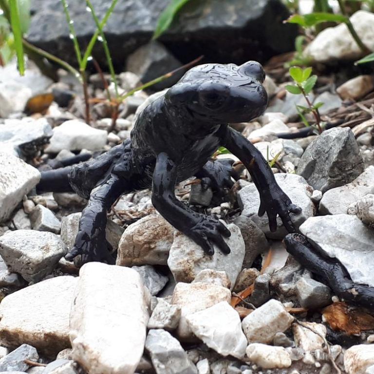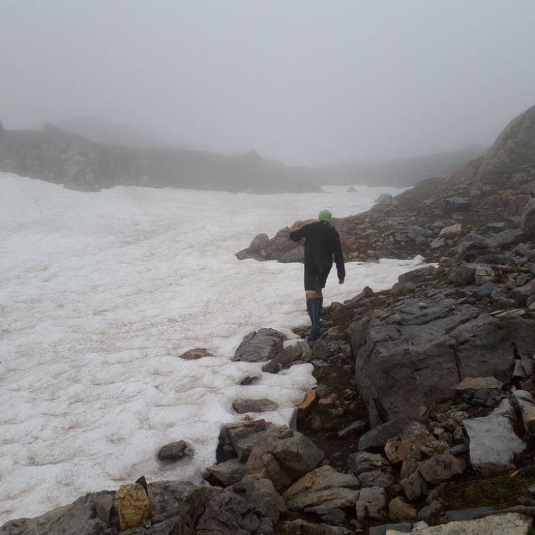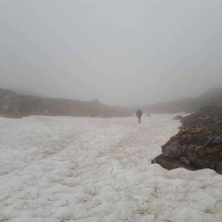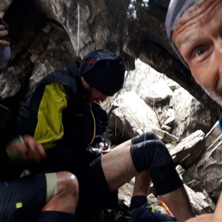 Irgendwie konnten wir den Verlust unserer Stöcke nicht auf uns sitzen lassen, deshalb schmiedeten Martin und ich den Plan ein weiteres Mal den Gipfel zu erklimmen. Das Wetter war für Freitag vielversprechend: Regen, kalt und vor allem keine, überhaupt keine Sonne :-) Als alle noch schliefen fuhren wir bei strömendem Regen mit den Mountainbikes in Richtung Flachauwinkl und von dort bis kurz vor der Ursprungalm. Unsere Bikes versteckten wir in den Bäumen und liefen zu Fuß weiter. Zuerst auf Forstwegen und dann auf kleinen Singletrails immer weiter nach oben. Unser erstes Ziel sollte die Windischscharte auf 2298 m sein. Teilweise war der Trail ausgesetzt und mit einem Stahlseil gesichert. Immer wieder räkelten sich Bergsalamander auf der Strecke. Wir musste schon aufpassen keinen der kleinen Kerle zu zertreten. Wir mussten beim Neukarsee einen Bach überqueren, der dank des vielen Regens doch ziemlich breit war. Hier holten wir uns schon mal nasse Füße. Langsam kamen auch die Schneefelder. Die geringe Sicht durch den dichten Nebel erschwerte die Suche nach dem richtigen Weg. Immer wieder mussten wir umkehren und es auf der anderen Seite des Schneefeldes erneut versuchen. Endlich erreichten wir die Windischscharte. Vor uns konnte man im Nebel die schneebedeckten Steilhänge des Mosermandls erahnen. Wir liefen, bzw. suchten weiter den Weg, der unter den vielen Schneefeldern verborgen war. Nach vielen Umkehr, Kletter - und Suchaktionen kamen wir endlich zur Weggabelung, wo es östlich nach unten ging und nach oben in den Klettersteig zum Mosermandl führte. Mittlerweile war es ziemlich eisig geworden und ich spürte meine Finger in den nassen Handschuhen kaum mehr. Trotzdem kletterten wir die seilversicherte, aber vereiste Rinne bis zum Gipfel nach oben. Yheeaaa, meine Stöcke standen noch am Gipfelkreuz, so wie ich sie vor 2 Tagen vergessen hatte. Ich stopfte sie in den Laufrucksack und wir machten uns auch wegen dem ungemütlichen Wetter schnell wieder auf den Weg nach unten. Und noch einmal kletterten wir durch die Rinne, bis zur Abzweigung. Bergab passierten wir Schneefelder, bis wir im dichten Nebel direkt vor der Höhle standen, in der wir vorgestern Schutz vor dem Gewitter suchten. Und auch hier waren wir erfolgreich. Auch Martins Stöcke lagen noch unberührt in der Höhle. Glücklich über unsere erfolgreiche Mission liefen wir zurück ins Tal und von dort bis zur Ursprungalm hinauf, wo unsere Mountainbikes standen. Durchnässt fuhren wir mit den Bikes ins Tal, um auf der anderen Seite bis zu unserer Hütte hochzudrücken. Hier ging mir nach fast 7 Stunden Ballern der Saft aus und ich kam gerade noch so nach 1 1/2 Stunden MTB mit 600 Höhenmetern und 17 Km und 5 Stunden Trails mit 22 km 1700 Höhenmetern ins Ziel :-) Unsere Kinder empfingen uns freudestrahlend, die Mamas eher nicht, weil wir länger als geplant unterwegs waren :-) Klar freuten wir uns auf den warmen Whirlpool zum Entspannen, bevor es ein leckeres Abendessen gab Mission Stöcke completed :-)