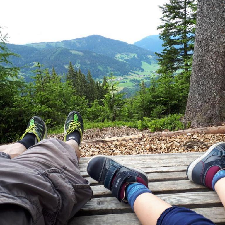 "Wir haben noch lange nicht genug" sangen schon die Onkelz, deshalb drauf auf den Lauf :-). Martin und ich liefen um halb 8 los, zuerst bis zur Südwienerhütte auf 1802 m und dann auf den Spirzinger mit 2066 m. Wir hatten eine Traumaussicht auf das Karwendel und die Tauern. Über coole Trails liefen wir wieder zurück zur Hütte. Insgesamt waren wir knapp 2 Stunden, 11 Kilometer und 800 Höhenmeter unterwegs. Nach einer kurzen Dusche und kleinem Frühstück fuhren wir nach Flachau. Hier gab es ein Spieleparadies für Kinder. Hüpfburgen, Rodelbahnen und Klettergerüste. Nach einem Mittagssnack fuhren wir auf einer kleinen Panoramastraße bis zum Waldgasthof, wo der Flori`s Erlebnispfad startete. Die Zwerge waren von dem erlebnisreichen Rundweg begeistert. Es gab eine Kletterwand, Flying Fox, Naturkino und Schaukeln. Nebenbei mussten die Kinder an jeder Station ein Rätsel lösen. Im Waldgasthof durften sich die Kleinen eine Überraschung abholen. Hier kehrten wir auch kurz ein, bevor es wieder zurück zur Hütte ging. Martin grillte uns am Abend leckere Steaks und Würstl