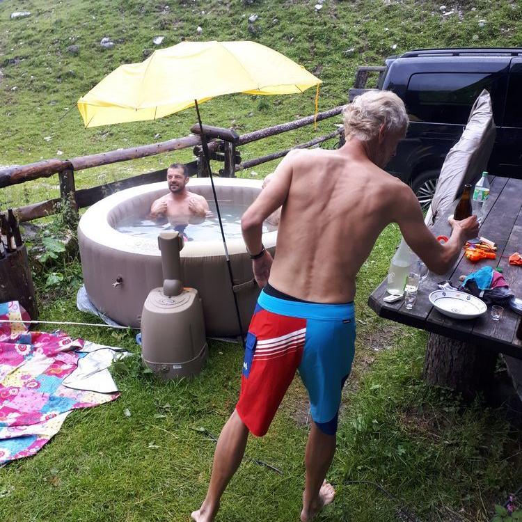 Auf dem 731 er Weg liefen wir über weitere Schneefelder bis wir alle drei gleichzeitig zusammenzuckten. Ein Blitz schoss nicht weit von uns zu Boden. Es fing zu hageln an und wir befanden uns auf einer freien Fläche. Ideale Voraussetzung in den Bergen :-( Weit und breit war kein Unterschlupf zu finden. Doch, direkt vor uns lag eine kleine Höhle. Wir krochen hinein. So richtig gemütlich war es zwar nicht, aber sicherer als draußen. Die Hagelkörner fanden den Weg durch die Ritzen und es wurde ganz schön eisig. Nach einigen Minuten war das Gewitter einige hundert Meter von uns weg. Wir wagten es weiterzulaufen, obwohl es von allen Seiten her schepperte. Nach einigen Minuten stellte Martin fest, dass es Unentschieden stand. Er hatte seine Lekis in der Höhle vergessen Auch dieses Mal war Umkehren keine Option. Dumm und Dümmer war der beste Ausdruck :-) Wir liefen immer weiter nach unten und die Gewitter verzogen sich ebenfalls immer mehr. Langsam wurde uns wieder wohler. Wir liefen unter der Tauernautobahn hindurch bis zur Gasthofalm und von dort unseren Forstweg bis zur Hütte nach oben. Hier wurden wir von unseren Kindern im warmen Whirlpool mit Wasserpistolen empfangen. Wir hatten uns nach 6 Stunden 26 Kilometern und 2200 Höhenmetern ein leckeres Weißbier verdient. Natürlich sprangen wir auch zu den Zwergen in den Whirlpool