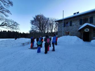 Nicht nur wir, sondern insgesamt 8 Familien wagten das Abenteuer in der einfachen Hütte. Bei traumhaftem Sonnenschein trafen wir uns am Wanderparkplatz in Rettenbach. Ob mit dem Schlitten, Tourenski, Wanderschuhe, Schneeschuhe oder Langlaufski, alle wollten zur Einöde aufsteigen. Emma startete zum ersten Mal mit den Tourenski und ich zog Timi teilweise mit dem Schlitten. Wir hatten schon beim Aufstieg einen riesigen Spaß. Ein kleiner Bergbach plätschert idyllisch links des Wanderweges Nr. 8.