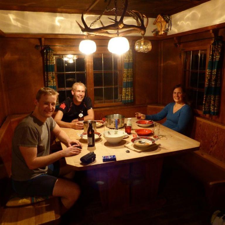 Freitagmittag stempelte ich in der Firma aus, holte Brigitte und ab ging es in die Berge. Am Schliersee bei 0 Grad und Nebel trafen wir uns mit den Tichy`s beim Edeka. Wir kauften für das Wochenende Proviant ein und ich gab Emma noch das Fläschchen. Dann fuhren wir zur Selbstversorgerhütte oberhalb des Spitzingsees. Ab ca. 1000 Höhenmeter stieg die Temperatur auf 12 Grad und über uns war blauer Himmel und der Sonne konnten wir noch beim untergehen zuschauen. Zuerst mussten wir am Spitzingsee eine Schranke passieren und dann konnten wir eine kurvenreiche Straße bis zur Hütte fahren. Wir luden alles aus, bauten die Kinderreisebetten auf, zündeten Feuer im Kachelofen an und dann machten wir es uns ersteinmal bequem. Christoph und ich entschieden uns, noch eine kurze Laufrunde vor dem Abendessen einzulegen. Mit Stirnlampe bewaffnet liefen wir eine Forststraße nach oben. Bogen dann auf einen Trail ab und bis wir uns versahen standen wir auch schon auf dem Gipfel des Jägerkamps mit seinen 1746 m. Auch hier oben war es noch relativ warm. Der Sternenhimmel bot sich über uns dar. Traumhaft !!! Nach knapp 1 1/2 Stunden und 600 Höhenmetern erreichten wir wieder unsere Hütte, wo unsere Mädels und ein Kasten Tegernseer auf uns warteten. Es gab leckere Spaghetti und dazu ein Bierchen. Der Abend machte riesig Spaß bei Musik, Wein, Bier und lustigem Geselllschaftsspiel. Bis wir uns versahen zeigte die Uhr 2 Uhr und es war Zeit sich in die Kojen zu verziehen :-)