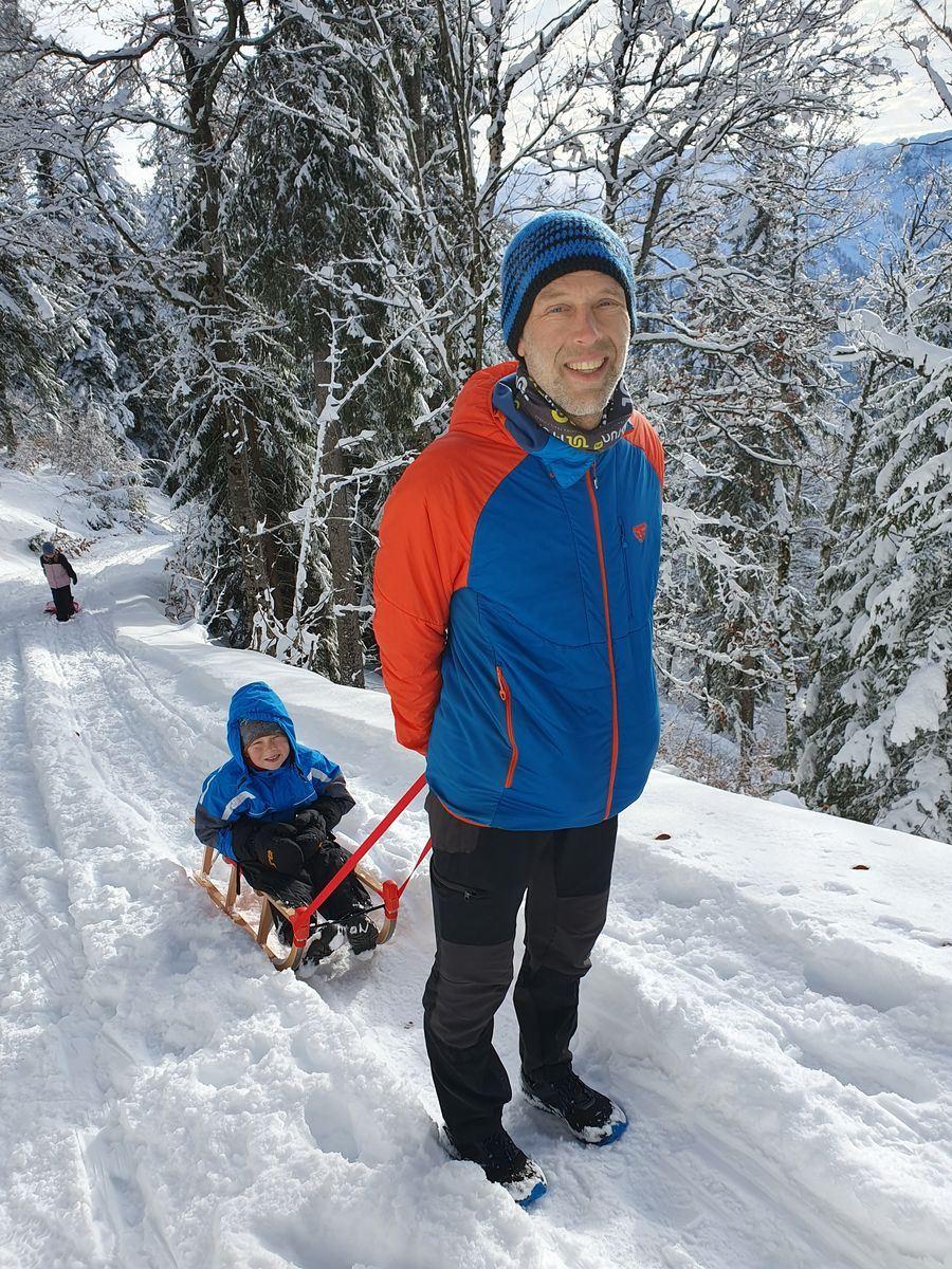 Am Morgen wurden wir von warmen Sonnenstrahlen geweckt. Blauer Himmel und ein wunderbares Winterwonderland begrüßten uns. Leider hatte mich ein Infekt schon seit Wochen fest im Griff und ich fühlte mich leider nur krank. Trotzdem wanderten wir nach einem ausgiebigen Frühstück durch den tiefen Schnee, mit Schlitten und Bob bewaffnet, in Richtung Rotwandhaus. Die Kinder taten sich sehr schwer, als wir durch den Schnee stapften. Timi musste ich letztendlich ziehen. Da sich meine körperliche Verfassung nicht gerade auf dem Höchststand befand und auch die Kinder nicht mehr weiterwollten, entschieden wir uns bei ca. 1400 Höhenmetern zur Umkehr