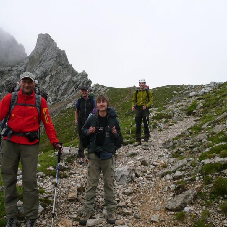 Nach einem guten Frühstück gingen wir um 8 Uhr los zum Einstieg in die Ostwand-Route. Nach kurzer Absprache bildeten wir unsere Seilschaften. Michael und Michael bildeten eine 2 er Seilschaft und gingen voran. Markus, Brigitte und Hans bildeten eine 3 er Seilschaft. Die Seilschaften wurden durch den Bergführer Werner begleitet und koordiniert.