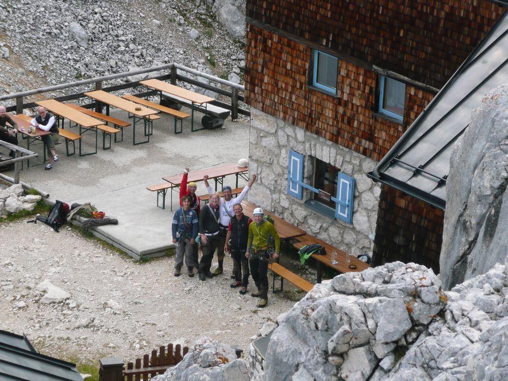 Die Tour war sehr anspruchsvoll, da einige 4+ Kletterstellen dabei waren, auch mit Steinschlag einer vorausgehenden Gruppe mussten wir kämpfen. Leider stimmte auch die Topo nicht mit der wirklichen Tour überein und somit wurde aus ursprünglichen 8 Seillängen ca. 15 bis wir 8 Stunden später erschöpft am Gipfel auf 2634 m ankamen. Nach kurzem Aufenthalt auf der Dreitorspitze NO-Gipfel begannen die Seilschaften sich auf der Westseite abzuseilen. Werner fand immer Zeit für Erklärungen und zeigte während Tour wie in verschieden Situationen reagiert und gehandelt werden kann. Auch das Teamgefühl und die Schnelligkeit wurden nach anfänglichen Startschwierigkeiten im Laufe der Begehung verbessert. Nachdem wir uns abgeseilt hatten stiegen wir im weglosen 2 er und 3 er Gelände hinunter zur Meilerhütte, die wir nach über 12 Stunden um kurz nach 20 Uhr erreichten. Ein langer Tag ging zu Ende und wir freuten uns schon auf das Abendessen und ein Weißbier.
