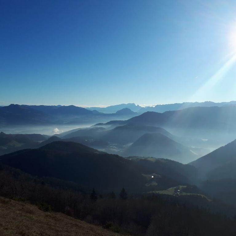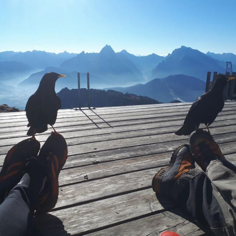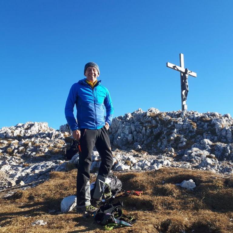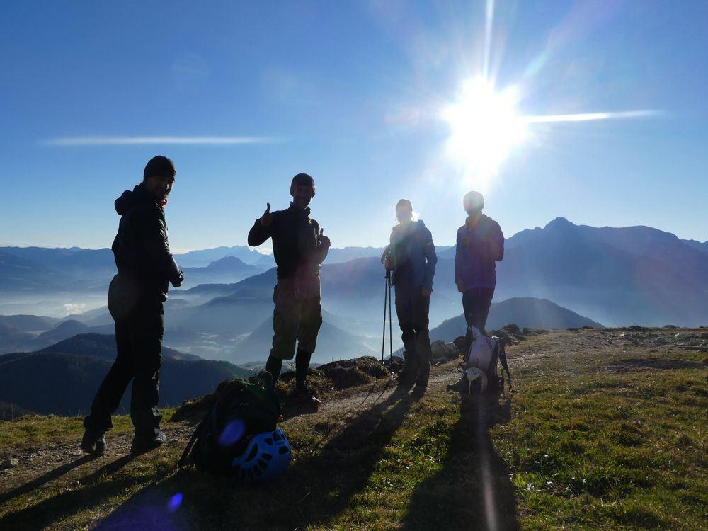 Das Wetter sollte an diesem späten Novembertag vielversprechend werden und es wurde auch so. Sonne, blauer Himmel, aber Minustemperaturen. Um halb 5 fuhren Brigitte und ich los, packten Hans und Jupp ins Auto und weiter ging es nach Marktschellenberg zum Ortsteil Ettenberg im Berchtesgadener Land auf ca. 800 m. Hier parkten wir am Wanderparkplatz. Minus 4 Grad zeigte das Thermometer, aber beim Aufstieg zum Almgebiet Scheibenkaser wurde uns schon warm. Hier hatten wir eine traumhafte Aussicht auf Watzmann, Dachstein und Co. Nach insgesamt 1 Stunden und 800 Höhenmetern Aufstieg standen wir auch schon am Klettersteigeinstieg zum sehr schönen und eindrucksvollen Sportklettersteig durch die Ostwand des Berchtesgadener Hochthrons. Der Steig wurde sehr elegant durch die steile Kalkwand gelegt und hat zahlreiche ausgesetzte Passagen - Gehstücke findet man fast keine. Der Steig gehört zu den besten Klettersteigen im Großraum Salzburg und wird sicher bald zum Klassiker werden. Wir kämpften uns Stahlseillänge um Stahlseillänge nach oben. Wie immer machte es riesig Spaß durch die Wand zu steigen. Wetter und Aussicht konnte nicht besser sein. Nach knapp 1 Stunden im Steig erreichten wir auch schon den Gipfel des Berchtesgadener Hochthrons mit seinen 1972 m. Hier hielten wir uns nicht lange auf, da ein eisiger Wind wehte. Auf dem markierten Weg marschierten wir zum geschlossenen Störhaus, wo wir auf der Terrasse einen sonnigen und windgeschützten Platz zum Brotzeit machen fanden. Ein paar Gebirgsdohlen bekamen auch ein paar Brotkrümel ab :-) Über den Stöhrweg stiegen wir zum Scheibenkaser ab und von dort zurück zum Parkplatz auf dem Aufstiegsweg. Nach insgesamt 5 Stunden reine Geh bzw. Kletterzeit erreichten wir auch schon wieder den Wanderparkplatz. In einem Café in Marktschellenberg fanden wir noch ein Siegerbier und Kuchen zur Stärkung bevor wir die Heimreise antraten.