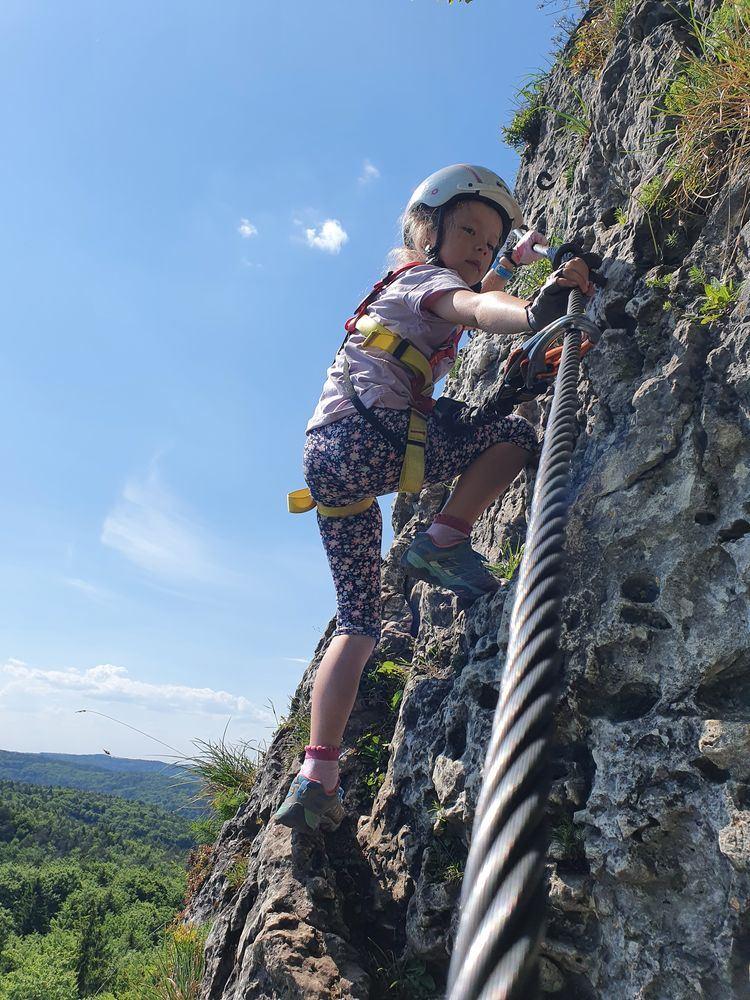 Seit ein paar Jahren gehört das Kletter- und Familiencamp in Hirschbach zu unseren Standard-Alpenvereinstouren. Unsere Kinder, wie auch wir freuten uns schon auf das Abenteuer mit dem Alpenverein Straubing in der Oberpfalz. Wir wurden vom Jura Alpin Chef Manfred und seiner Frau sehr freundlich empfangen und durften umgehend unsere Zimmer beziehen. Die gesamte Alpenvereinsgruppe marschierte dann zum 45 Minuten entfernten Einstieg des Höhenglück-Klettersteigs. Die Erfahrenen Klettersteiggeher wagten sich sofort in den Steig und die kleineren Kinder übten zuerst im Bambini Steig. Unsere 8-jährige Emma durchstieg zum 3. Mal den Höhenglücksteig. Das Klettersteigabenteuer machte allen sehr viel Spaß und um für neue Taten gewappnet zu sein, grillte Manfred ein leckeres Abendessen.