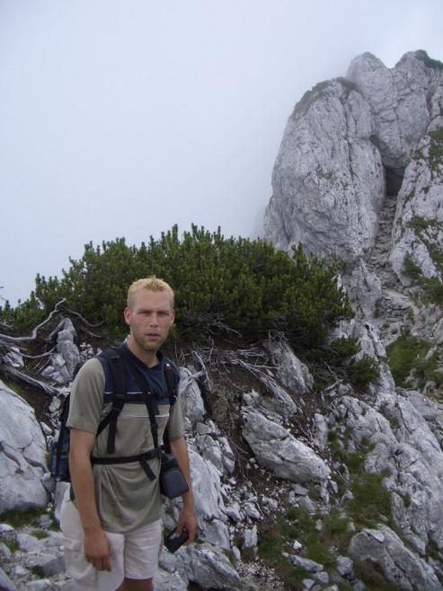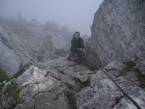 Mit dem Bus ging es dann zum Parkplatz am Kehlsteinhaus. Ein mit Naturstein ausgeschlagener Tunnel führt 124 Meter weit durch das Felsmassiv zu einem prunkvollen, messingverkleideten Aufzug. In nur 41 Sekunden fährt dieser Aufzug weitere 124 Meter in das Innere des Kehlsteinhauses (Eagles Nest 1834 m). Am Haus vorbei Richtung Südosten zum Gipfel des Kehlstein und anschließend leicht fallend zum Einstieg des Klettersteigs. Wir gehen ohne Klettersteigausrüstung, die nicht unbedingt erforderlich ist, aber wer sich sicherer fühlt, sollte sie unbedingt anlegen. Nach einigen drahtseilgesicherten Stellen stößt man auf zwei spektakuläre Engstellen
