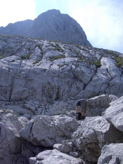 Der Klettersteig führt nun immer entlang des Mannlgrates, mal links und mal rechts davon, sowie in ständigem Auf und Ab, hinüber zur Gipfelflanke. Über eine steile Felsstufe klettert man hinauf in die schotterige Flanke und hier entlang von Steigspuren und spärlichen Markierungen steil empor. Die letzten Meter des Klettersteigs werden von einer Leiter aus Drahtklammern gebildet. Auf 2253m trifft man auf die Abzweigung zum Purtscheller Haus.