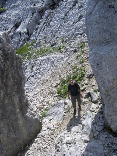 Am Haus vorbei Richtung Südosten zum Gipfel des Kehlstein und anschließend leicht fallend zum Einstieg des Klettersteigs. Nach einigen drahtseilgesicherten Stellen stößt man auf zwei spektakuläre Engstellen.