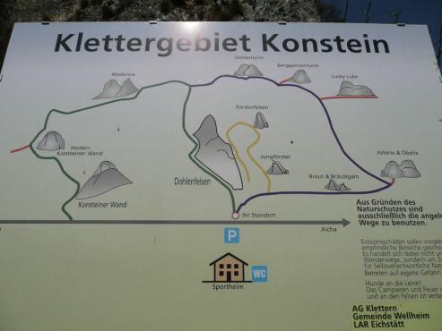 Ich fuhr schon früh ins Altmühltal. In Dollnstein bog ich ab nach Konstein. Dort parkte ich am Parkplatz direkt unterhalb des Dohlenfelsens. Ich packte die Ausrüstung und wanderte los. Neben den Dohlenfelsen beginnt die Markierung blau und rot. Ein paar Minuten ging es steil nach oben bis sich die Markierungen trennten. Die Markierungen wurden 2008 perfekt erneuert und waren nicht zu verfehlen. Nach ca. 15 Minuten kam ich zu den ersten Seilversicherungen. Der Klettersteig verläuft immer seitwärts und ist sehr gut gesichert. Es machte Spaß auf den Stahlstiften, Felstritten und Trittstiften sich fortzubewegen. Für Anfänger ideal zum üben und nicht zu schwierig. Wer sich sicher fühlt benötigt keine Klettersteigausrüstung. Der Klettersteig ist auch ideal für Kinder, leider wurden wir immer wieder etwas gebremst. Da ich aber ein herrliches, sonniges Wetter hatte, eilte es nicht und ich genoss die Sonne. Immer wieder kreuzte der Steig die Kletterfelsen die stark besucht waren. Nach ca. 1 1/2 Stunden im Klettersteig erreichte ich durch eine Lochwand das Ende des Klettersteiges. Ein paar Meter weiter ging ich den leichteren Oberlandsteig rot (nur einmal Seilversichert) wieder zurück. Da es erst früh am Nachmittag war und ich mein Mountainbike im Auto hatte, fuhr ich weiter nach Dollnstein, wo ich durch den historischen Ortskern zum Torturm und dann 16 km den Altmühlradweg nach Eichstätt fuhr. Dort gab es dann ein verspätetes Mittagessen, bevor ich wieder zum Auto in Dollnstein radelte.