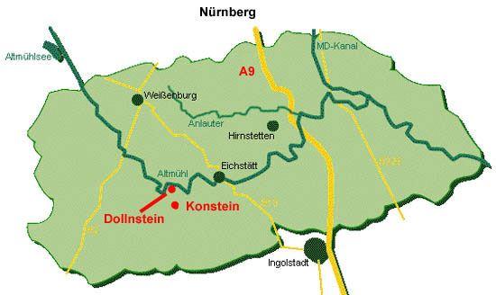 Von der A9, Ausfahrt "Altmühltal" nach Eichstätt, weiter nach Dollnstein, dort nach Süden nach Konstein. Dort zunächst durch den Ort durch, nächstmögliche links, an einer links abbiegenden Vorfahrtsstraße, kurz links, dann rechts in die "Seitenstraße". Nach erstem Haus rechts Hinweisschilder.
