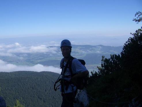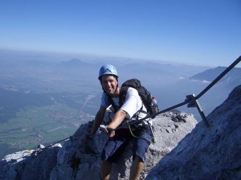 Ich zog die Ausrüstung an und los gings in den Felsen. Insgesamt war ich 3 Stunden im Klettersteig unterwegs. Ich hatte Schwielen an den Händen, da es fast immer senkrecht die Wand hochging und ich mich viel an den Seilen hochziehen musste. Ich versuchte so gut wie möglich meine Füße einzusetzten. Der Klettersteig ist immer bestens gesichert, aber extrem anstrengend. Ich war sehr erleichtert, als ich den Gipfel erreichte. Viel länger hätte ich nicht mehr gekonnt. Immer wieder mußte ich im Klettersteig zu Überholmanövern ansetzten, da viele Gruppen etwas langsam unterwegs waren. Das letzte Stück war äusserst anstrengend und verlangte mir alles ab.