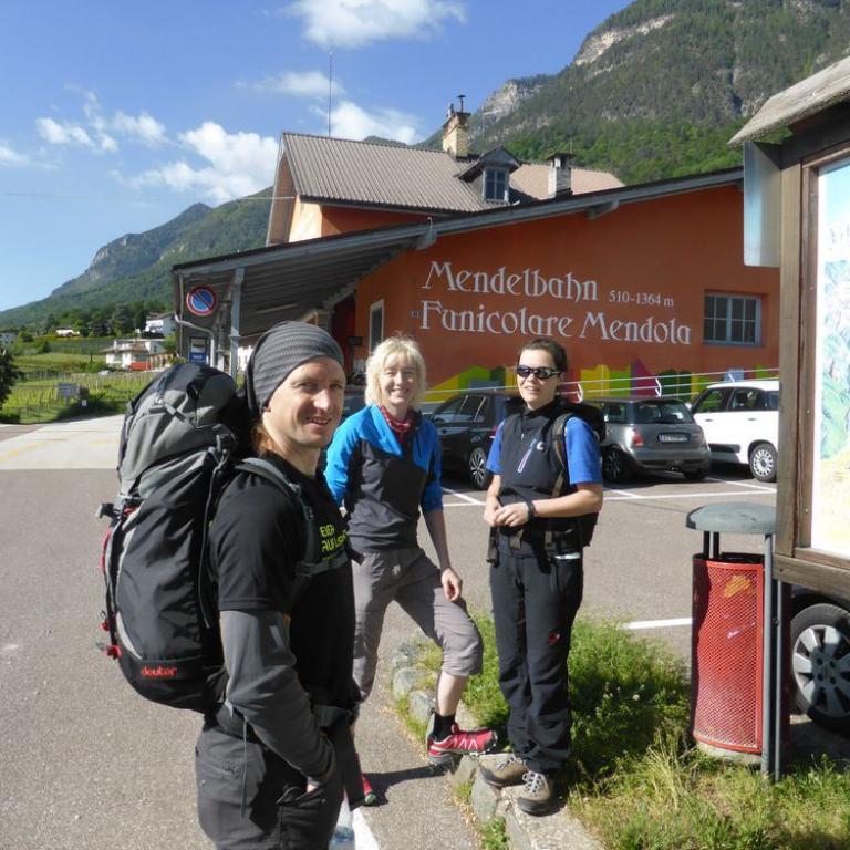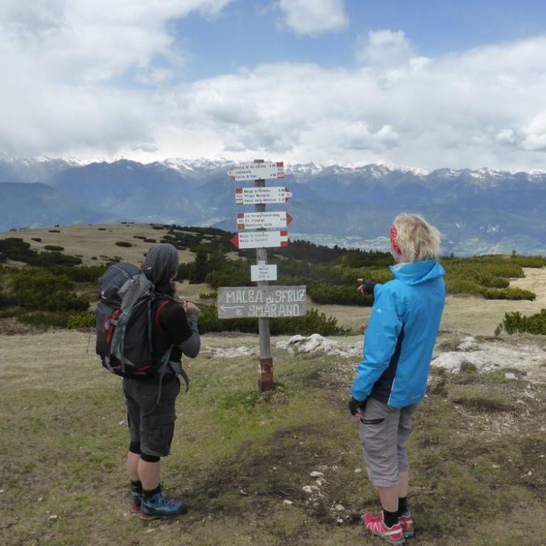 Vom Mendelpaß (1363m) in schöner, nur wenig ansteigender Wanderung auf Weg Nr. 521 durch den Wald über die Halbweg-Hütte (1594m) zur Roèn-Alm (1773m). Weiter auf einem Fahrweg (Markierung 560) zur Überetscher Hütte (1773m).