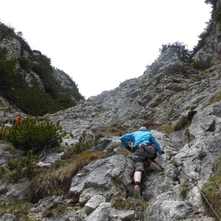 Dieser führt zunächst nach rechts durch eine Rinne empor. Dann quert man nach links und erreicht eine relativ steile Wand. Über diese gut gesichert und nur wenig schwierig hinauf zum Ausstieg des Klettersteigs knapp unter dem Bergkamm. Auf einem Wanderweg zur Kammhöhe und in einer langen Linksquerung weiter zum Gipfel des Monte Roèn.