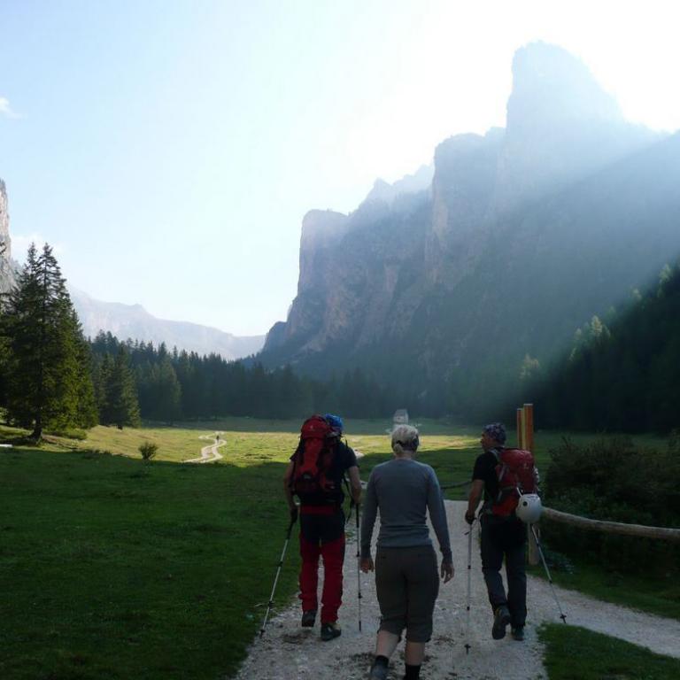 Über die Brennerautobahn bis nach Klausen und weiter ins Gardenatal bis nach Wolkenstein. Am Ortsanfang von Wolkenstein der Straße ins Langental folgen und bis zum gebührenpflichtigen Parkplatz beim Imbisstand fahren(Parkautomat, Ende der Fahrmöglichkeit).