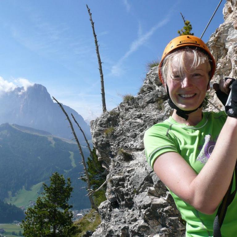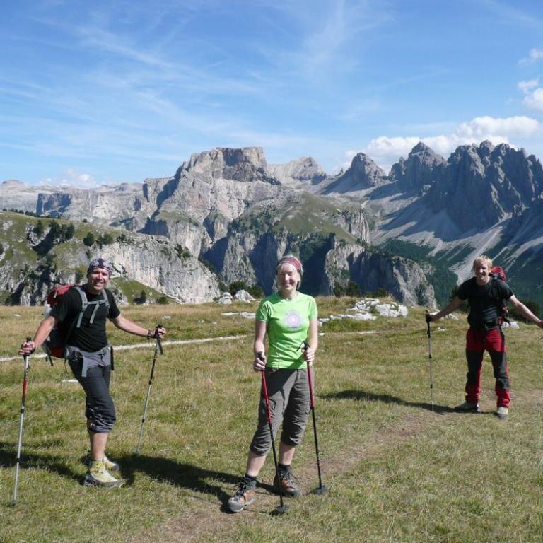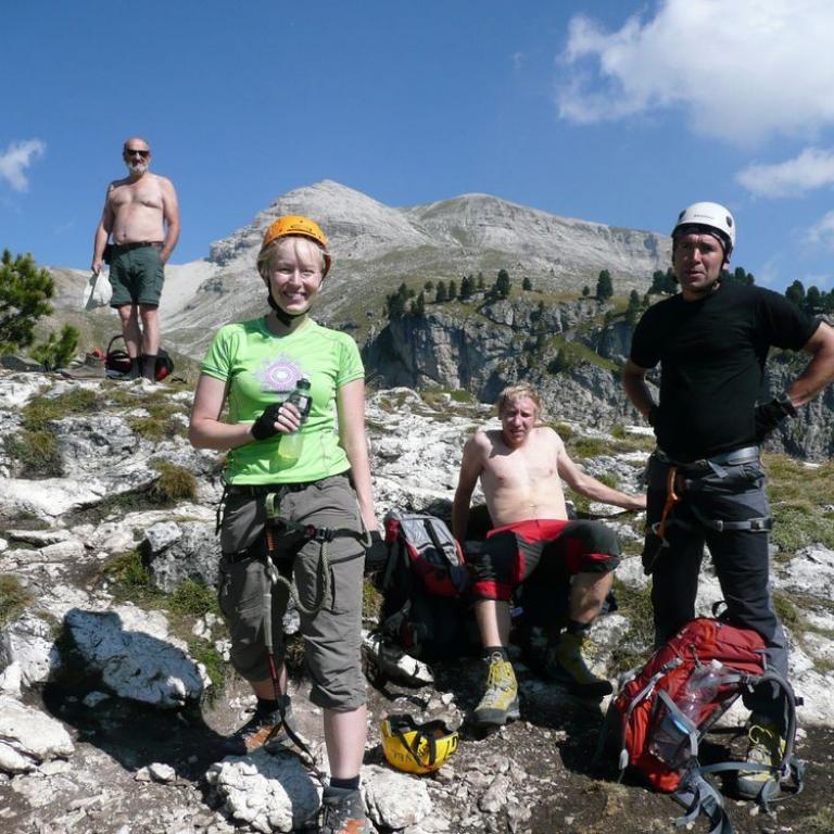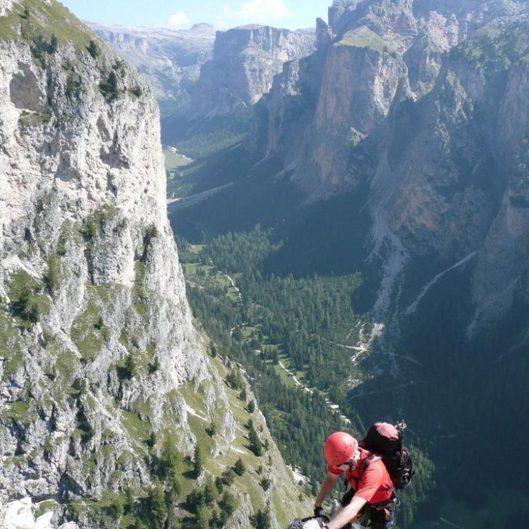 Obwohl Hans, Wolfi, Brigitte und ich in den letzten 6 Tagen die Dolomiten von Nord nach Süd durchquert hatten, wollten wir trotzdem noch den schwierigen Klettersteig Via Ferrata Sandro Pertini meistern. Noch immer nicht genug von den Bergen und immer noch mit frischen Beinen fuhren wir ins Langental über Wolkenstein. Zuerst wanderten wir durch das herrliche Tal, aber nach knapp 20 Minuten erreichten wir auch schon den Einstieg. Der Klettersteig ist super gesichert und teilweise benötigt man Armkraft für ein paar überhängende Stellen. Der Ausblick auf das Langental und die Dolomiten ist einfach herrlich. Spektakulär ist auch eine Seilbrücke von wo man in die Tiefe sehen konnte. Nach knapp über 2 Stunden im Steig erreichten wir den Ausstieg, von wo wir noch eine bessere Sicht hatten. In ca. 15 Minuten gelangten wir dann zur Stevia Hütte auf 2312 m, wo es eine deftige Brotzeit mit Weißbier gab. Von der Stevia Hütte ging es dann zur St. Sylvester Scharte und weiter über den Expressabstieg und weiter durch das Langental bis zum Parkplatz.