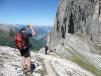 1. Teil: Zuerst über steiles Plattengelände (mit Klammern gut versichert) aufwärts (C/D), nun wird das Gelände etwas gestufter (B/C bis C) und man kommt zu einer leichten Linksquerung (A). An deren Ende führt ein steiler Aufschwung (C) wieder in gestufte Abschnitte (B). Teils rechts- oder linksquerend, oder direkt am Grat gewinnt man an Höhe (A bis B). Nach einem rinnenartigen Kamin (B) folgt ein schweres Steilstück (C), das dann in eine Scharte führt. Hier markant absteigen (A/B) und dann über eine tiefe Spalte (Spreizschritt, B) zu einer steilen Wandstelle (C), die in leichteres, etwas brüchiges Gelände (A/B) mündet. Man erreicht die Abzweigung zum "Abstieg" rot markiert, der Abstieg verläuft nach rechts.