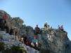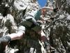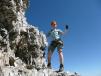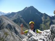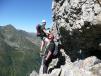2. Teil: Man überwindet eine steile Wandstelle (B/C) um dann in leichterem Gelände nach links absteigend (B) in eine schluchtartige Rinne (A) zu gelangen. Das Ende der Rinne ist steil (B/C) und wird von einem großen Klemmblock bedeckt. Nach dem Steilstück erreicht man über kurze Aufschwünge (B) das kleine Gipfelplateau.