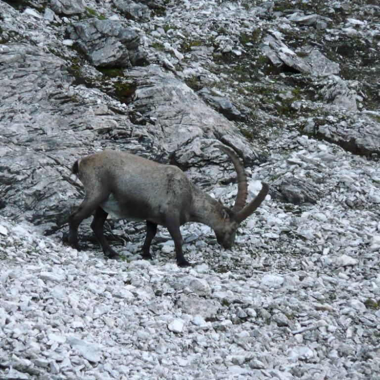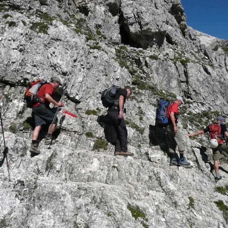 Über das obere Steigdrittel wieder absteigen und dann nach rechts kurz den Versicherungen (A) folgen. Ab deren Ende auf Steigspuren der Wand entlang. Eine kleine Schlucht ist dann wieder versichert (A). Nun weiter um eine Geländekante herum und über gestuftes, brüchiges Gelände (A/B) in die große Schutthalde absteigen. Kurz in der Schutthalde linkshaltend abwärts bis zu einem Pfeiler, der den Schutt "aufstaut" (Markierung). Hier beginnt eine Klammerreihe (B), über die man steil den Pfeiler hinuntersteigt. An deren Schluss sind statt Klammern sogar nur Stifte (B). Nun weiter (Markierung und Versicherungen) kurz aufsteigen, um eine Kante und in das parallele Schuttfeld mit Hilfe zahlreicher Versicherungen (A/B) absteigen. Den Markierungen zuerst absteigend, später aufsteigend zurück zum Einstieg folgen.
