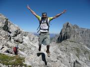 2. Teil: Man überwindet eine steile Wandstelle (B/C) um dann in leichterem Gelände nach links absteigend (B) in eine schluchtartige Rinne (A) zu gelangen. Das Ende der Rinne ist steil (B/C) und wird von einem großen Klemmblock bedeckt. Nach dem Steilstück erreicht man über kurze Aufschwünge (B) das kleine Gipfelplateau.
