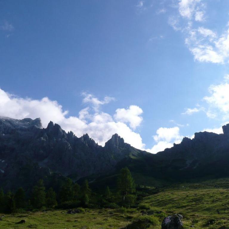 Vom Parkplatz der Erichhütte auf einer Forststraße zur Hütte aufsteigen. Von der Erichhütte auf Weg 432 weiter in die Hochscharte. Auf 2.220 m folgt ein Wegweiser. Dort links abzweigen und in wenigen Minuten zum Einstieg.