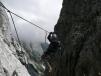 1. Teil: Nach heftigem Einstieg (D) führt eine flache Rinne (C) auf den "Flower Tower". Nach einem flachen Grat (B) wird in eine Scharte abgestiegen (B). Anschließend wird der Mühlbacher Turm erklommen (B/C). Es folgen die Via-Mala-Schlucht (C/D) und der Spreizschritt "Jungfrauensprung" (C). Über die Porti-Sport-Diretissima (zuerst B/C, dann C) wird der Teufelsturm erstiegen. Anschließend geht es steil hinunter (zuerst C, dann C/D) auf die fünf Meter lange luftige Dreiseilbrücke "Kranabetter-Steg" (B/C) über die Teufelsschlucht. Auf der Lehner-Traverse (C) wird noch ein Stück abgeklettert. Es folgt ein kurzer ungesicherter Abschnitt (1-) bevor wieder versichert (C) ein Grat (B) erreicht wird. Steil geht es anschließend in den Sallerriss (C/D) hinunter. Wer nicht ganz in diese tiefe Scharte abklettern will, kann den Flying Fox benutzen und so auf die gegenüberliegende Seite gelangen. Anschließend geht es steil (zuerst B, dann C) auf das 2.522 m hohe Teufelshörnl. Über den luftigen Brücknergrat (B/C bis C/D) wird im ständigen Auf und Ab die Dientner Schneid (C/D) erreicht. Es folgt die ebenfalls luftige Bosch-Promenade (meist B). Über eine kurze Abkletterstelle (C/D) wird eine Scharte erreicht. Hier befindet sich ein Notausstieg ins Birgkar.