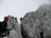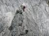 2. Teil: Über einen Schrofenrücken (zuerst A/B, dann 1-) zum Fuß des Kematsteins. Der lange Aufschwung "Franzl's Fantastica" (zuerst D, dann C/D) führt in herrlich festem Fels auf den 2.772 m hohen Kematstein. Über einen flachen Grat (A/B) wird der Gipfel erreicht. Über die "Brandner Abfahrt" (zuerst B/C, dann C) geht es hinunter in eine Scharte. Nach einer Querung geht es steil hinauf (D) auf den Franz-Eduard-Matras-Kopf. Es folgen noch ein paar interessante Spreizschritte (max. C). Über den durch eine kurze Platte (C/D) unterbrochenen Grat (A/B) wird der Ausstieg am südlichen Hohen Kopf erreicht.
