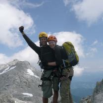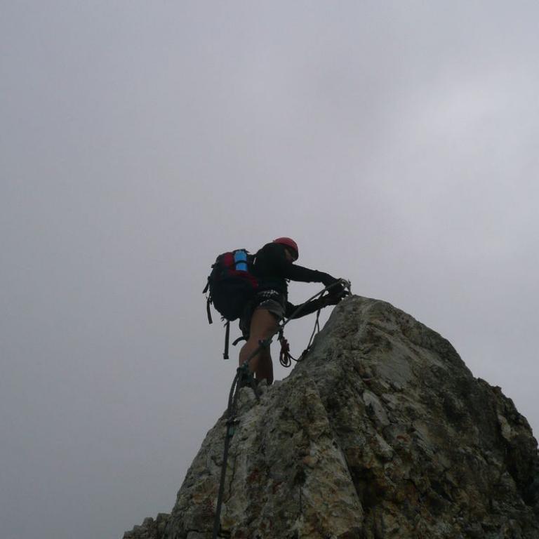2. Teil: Über einen Schrofenrücken (zuerst A/B, dann 1-) zum Fuß des Kematsteins. Der lange Aufschwung "Franzl's Fantastica" (zuerst D, dann C/D) führt in herrlich festem Fels auf den 2.772 m hohen Kematstein. Über einen flachen Grat (A/B) wird der Gipfel erreicht. Über die "Brandner Abfahrt" (zuerst B/C, dann C) geht es hinunter in eine Scharte. Nach einer Querung geht es steil hinauf (D) auf den Franz-Eduard-Matras-Kopf. Es folgen noch ein paar interessante Spreizschritte (max. C). Über den durch eine kurze Platte (C/D) unterbrochenen Grat (A/B) wird der Ausstieg am südlichen Hohen Kopf erreicht.