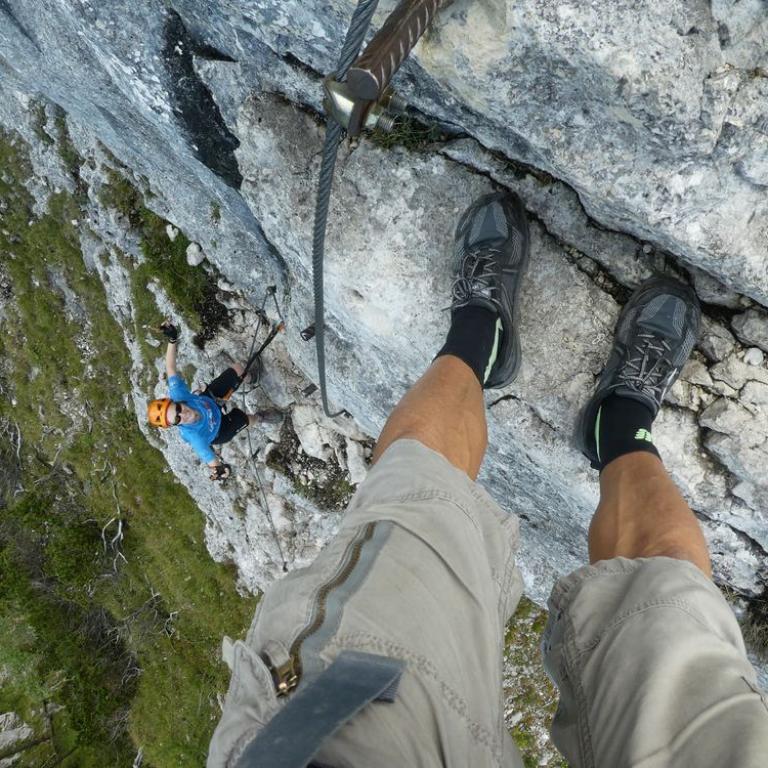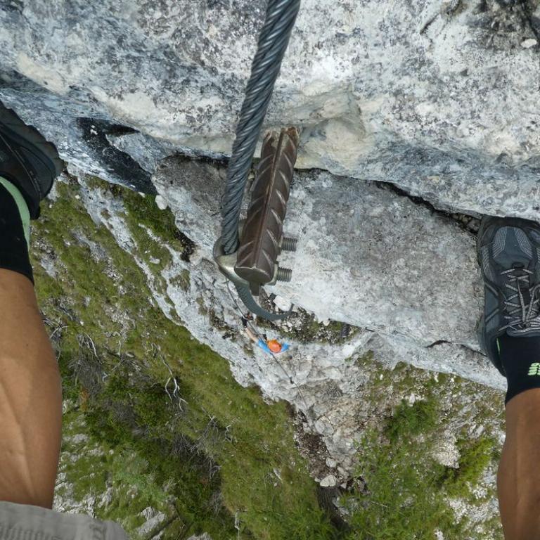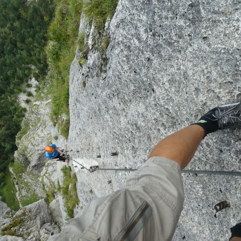 Der Klettersteig ist ganz oben - also kurz vor dem Ausstieg - noch einmal schwer (schwere D-Stelle). Deshalb sollten Konditionsschwache, Unerfahrene und Kinder den Klettersteig wegen der Länge meiden!