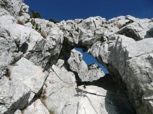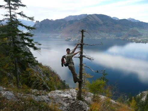 Aufstieg über den Naturfreundesteig (4 bis 5 Stunden): Wir folgten der Forststraße und durchqueren 2 Tunnel. Nach ca. 20 Minuten erreichten wir den Einstieg in den Naturfreundesteiges. Ab hier folgten wir dem markierten und über weite Teile gesicherten und abwechslungsreichen Klettersteig durch die Westseite des Traunsteins. Zwischen ausgesetzten Felspassagen (Seilsicherungen) und lichtem Hochwald genoßen wir tolle Tiefblicke zum See! Kurz bevor wir das Traunsteinhaus, 1580 m (auch Naturfreundehaus genannt) und damit das Ende des Klettersteiges erreichten, führte uns der Steig durch ein markantes Felsentor. Das Traunsteinhaus hatte leider geschlossen. Trotzdem legten wir eine kleine Pause ein und stärkten uns mit einer Brotzeit.