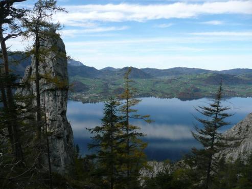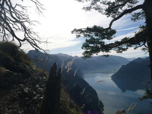 Direkt an der Gmundner Hütte beginnt der Abstieg über den Hernlersteig (leichter bis mittelschwerer Klettersteig A/B). Der Steig weist ein paar wirkliche "Klettersteigstellen" auf, ansonsten meist steiles Gehgelände mit herrlicher Aussicht auf den See.