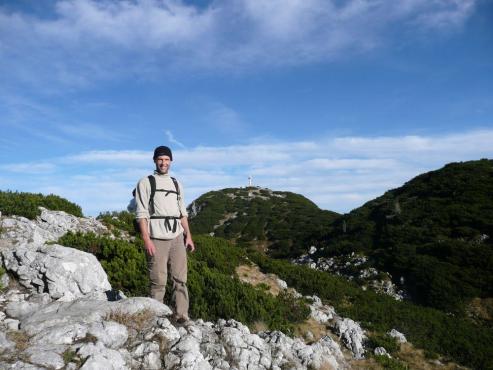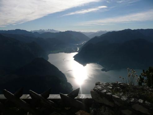 Am Traunsteinhaus vorbei führte uns der Weg nun ohne große Steigungen zur Gmundner Hütte, 1666 m. Von hier aus ist in wenigen Minuten der Gipfel des Traunsteins, 1691 m, östlich der Hütte erreicht. Abstieg über Hernlersteig (ca. 3 Stunden): Direkt an der Gmundner Hütte begann unser Abstieg über den Hernlersteig (leichter Klettersteig A/B). Der Steig weist ein paar wirkliche "Klettersteigstellen" auf, ansonsten meist steiles Gehgelände. Auch von hier aus hat man eine schöne Aussicht auf den Traunsee. Wir mussten uns beeilen und erreichten kurz nach Einbruch der Dunkelheit den Parkplatz