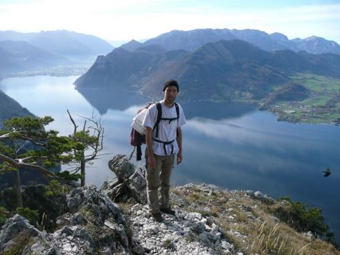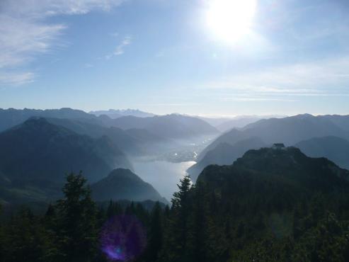 Am Traunsteinhaus vorbei führte uns der Weg nun ohne große Steigungen zur Gmundner Hütte, 1666 m. Von hier aus ist in wenigen Minuten der Gipfel des Traunsteins, 1691 m, östlich der Hütte erreicht. Abstieg über Hernlersteig (ca. 3 Stunden): Direkt an der Gmundner Hütte begann unser Abstieg über den Hernlersteig (leichter Klettersteig A/B). Der Steig weist ein paar wirkliche "Klettersteigstellen" auf, ansonsten meist steiles Gehgelände. Auch von hier aus hat man eine schöne Aussicht auf den Traunsee. Wir mussten uns beeilen und erreichten kurz nach Einbruch der Dunkelheit den Parkplatz