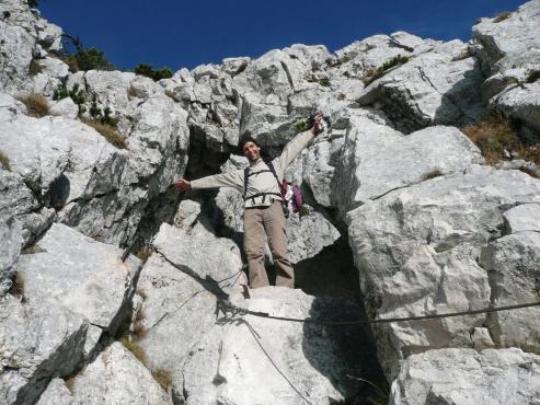 Aufstieg über den Naturfreundesteig (4 bis 5 Stunden): Wir folgten der Forststraße und durchqueren 2 Tunnel. Nach ca. 20 Minuten erreichten wir den Einstieg in den Naturfreundesteiges. Ab hier folgten wir dem markierten und über weite Teile gesicherten und abwechslungsreichen Klettersteig durch die Westseite des Traunsteins. Zwischen ausgesetzten Felspassagen (Seilsicherungen) und lichtem Hochwald genoßen wir tolle Tiefblicke zum See! Kurz bevor wir das Traunsteinhaus, 1580 m (auch Naturfreundehaus genannt) und damit das Ende des Klettersteiges erreichten, führte uns der Steig durch ein markantes Felsentor. Das Traunsteinhaus hatte leider geschlossen. Trotzdem legten wir eine kleine Pause ein und stärkten uns mit einer Brotzeit.