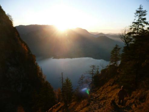 Direkt an der Gmundner Hütte beginnt der Abstieg über den Hernlersteig (leichter bis mittelschwerer Klettersteig A/B). Der Steig weist ein paar wirkliche "Klettersteigstellen" auf, ansonsten meist steiles Gehgelände mit herrlicher Aussicht auf den See.