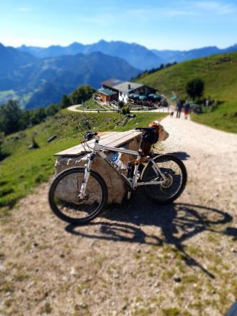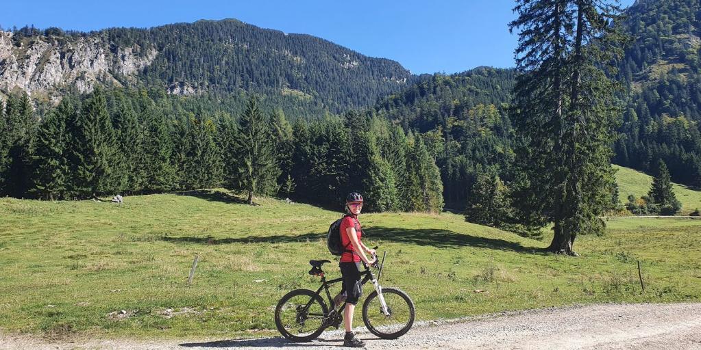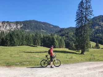 Gestärkt radelten wir zuerst nach Bernau und von dort weiter durch das schattige Weißachental bis zum Wanderparkplatz Kohlstatt. Auf teilweise steilen Forstwegen kämpften wir uns zur sonnigen Jochbergalm hoch, wo wir einkehrten. In der Sonne genossen wir eine "Radler" und eine leckere Almbrotzeit.