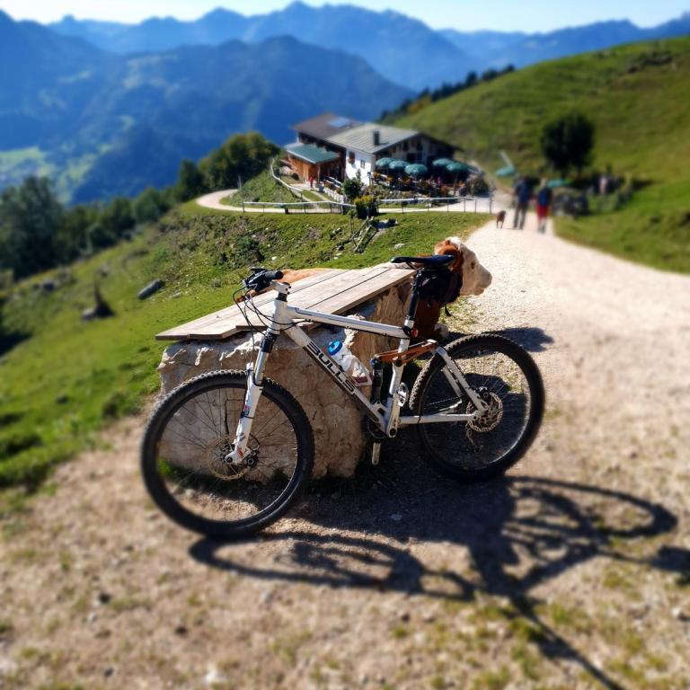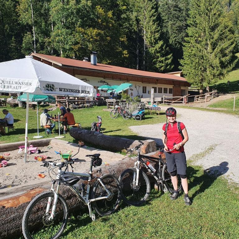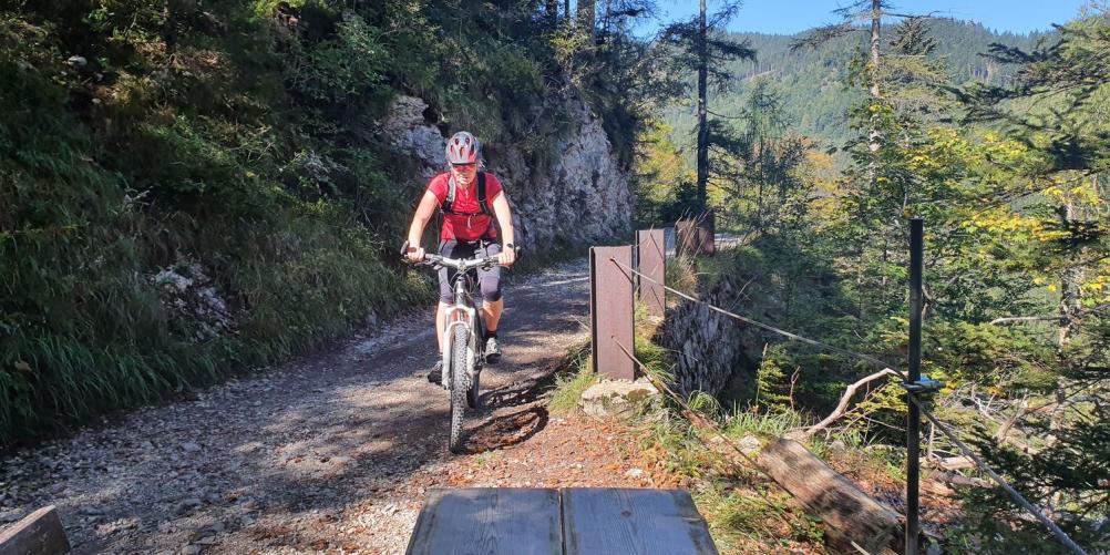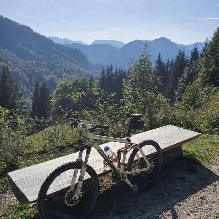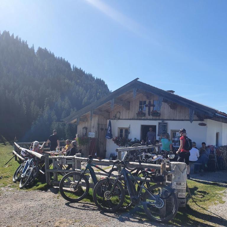Über eine teilweise Schiebestrecke gelangten wir zur Rechenbergalm und von dort über abenteuerliche Trails zur Feldlahnalm, wo wir nochmals einkehrten. Ab hier fuhren wir über Forstwege nach Oberwössen und zurück nach Grassau zum Reifinger See.