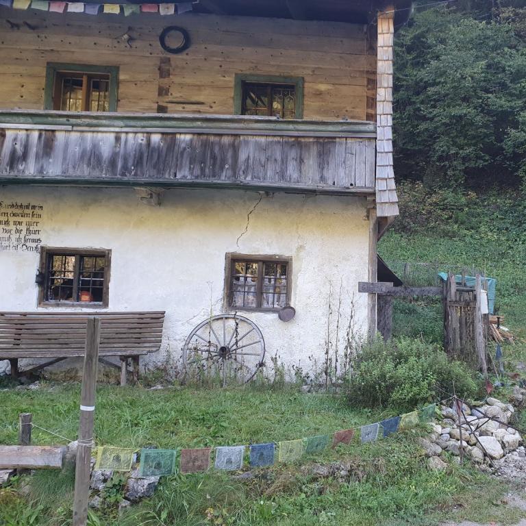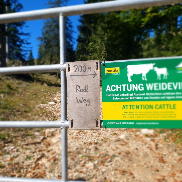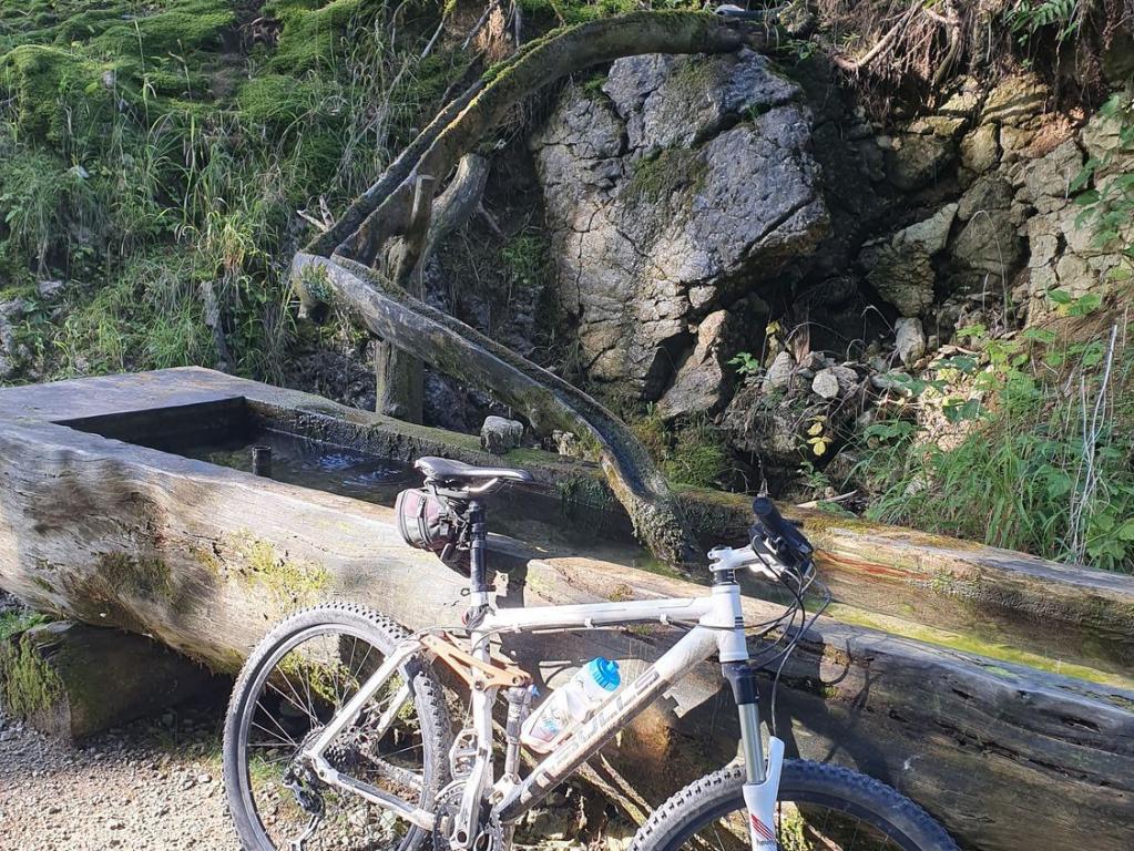 Hier kann man wieder auf das Mountainbike aufsteigen und es rollen lassen. Jetzt wird es etwas schwierig den Weg zu finden. Am besten man nimmt den ersten Abzweiger nach links zu den Burgau Almen, Hammergraben, Oberwössen oder Feldlahnalm. Es gibt noch einen weiteren Weg weiter unten, den wir genommen haben. Dieser endet aber und man muss das Mountainbike ein kleines, abenteuerliches Stück über Dornengestrüpp und einen Weidezaun bis zur Burgau Alm tragen. Hier befindet sich eine kleine Kapelle. Wenn man den ersten Weg genommen hat, befindet man sich schon oberhalb der Burgau Alm. Ansonsten muss man wieder nach oben radeln, bis man auf einen Wassertrog stößt. hier läuft das Quellwasser über einen ausgehölten Ast in den Trog.