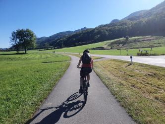 Bei herrlichem Sonnenschein fuhren wir zuerst in die Ortsmitte von Grassau. Da Brigittes Fahrradkette defekt war, bekamen wir im Radhaus Grassau eine neue montiert. Ein super und schneller Service. Bevor unsere Tour starten konnte, kauften wir uns noch beim Bäcker ein kleines Frühstück, das wir in der Sonne genossen.